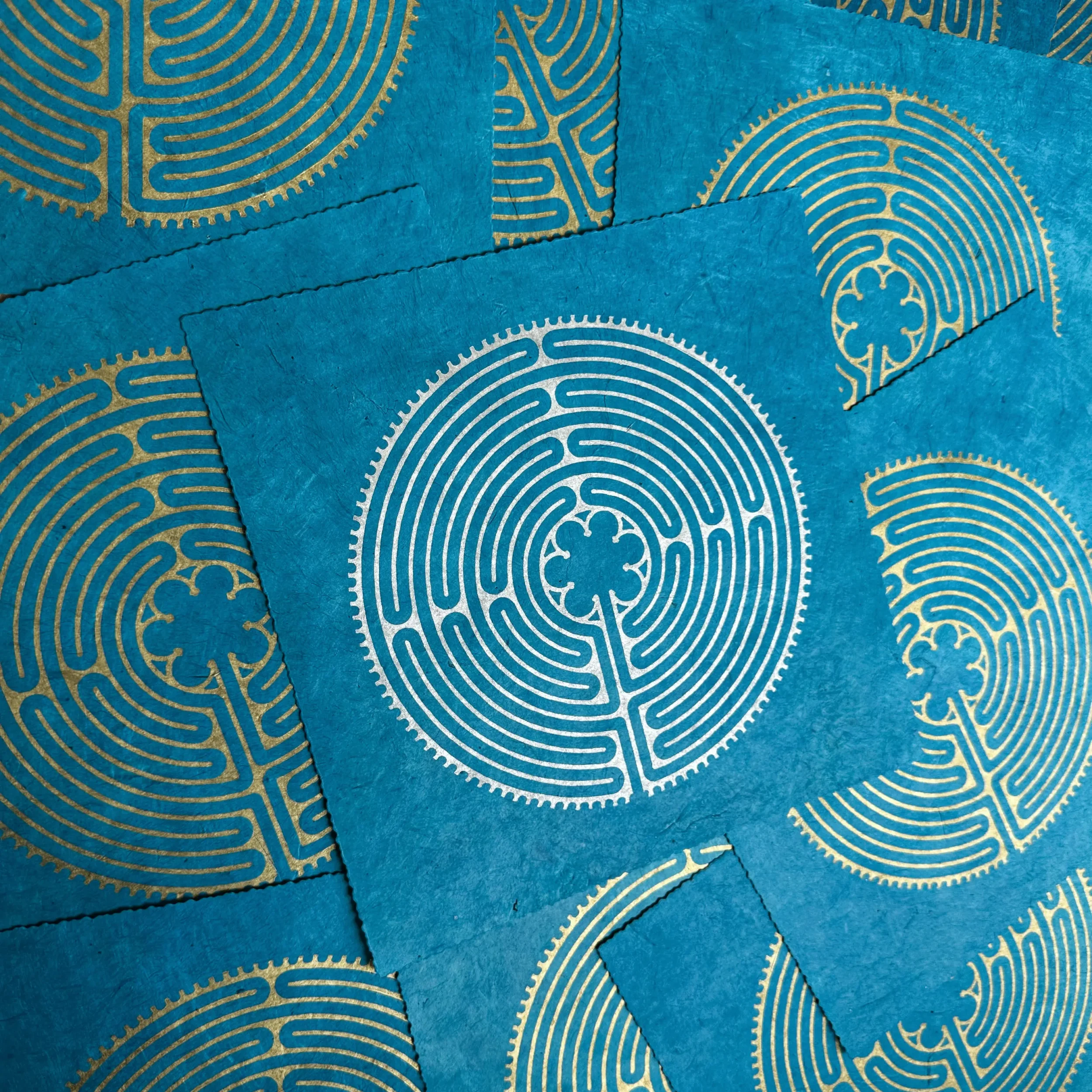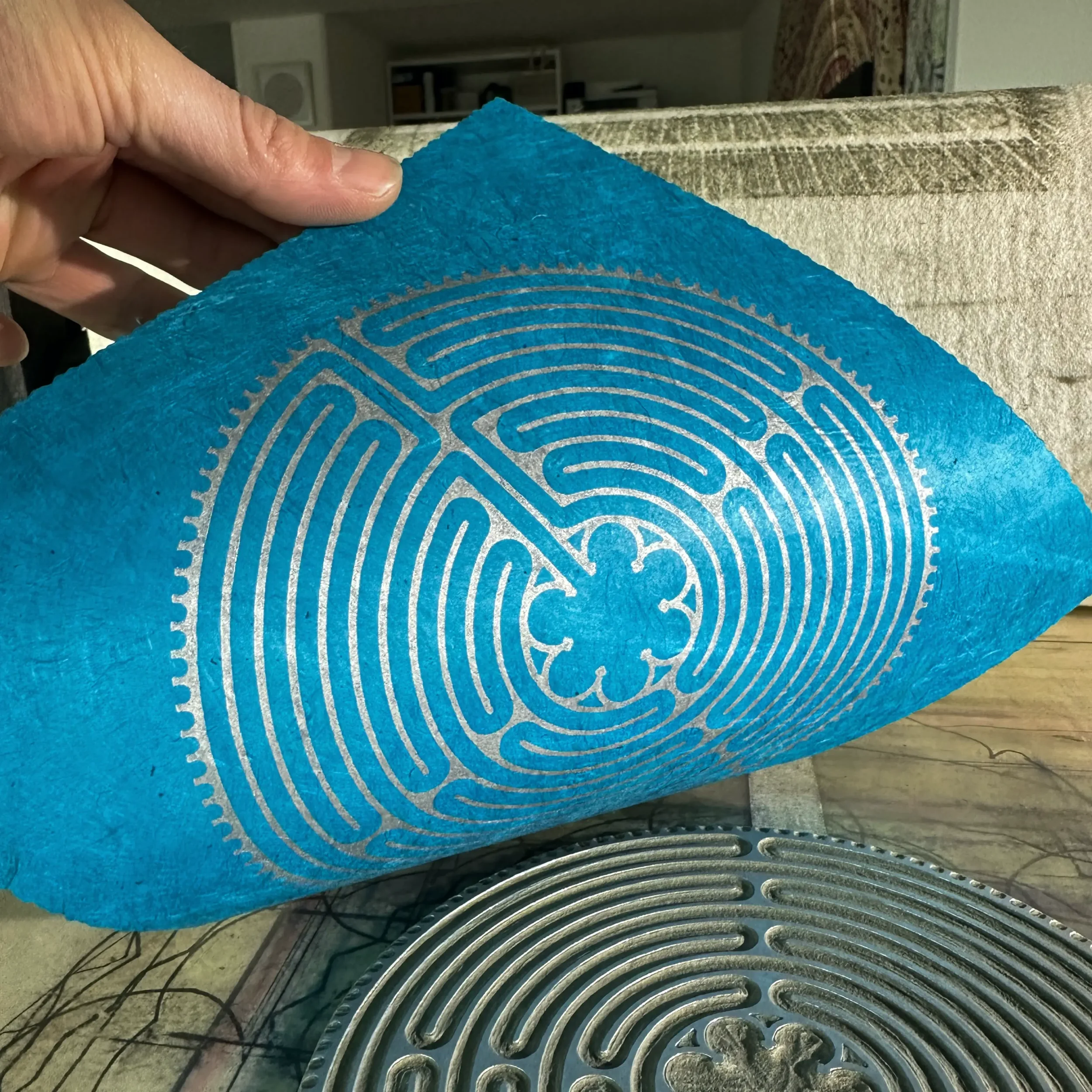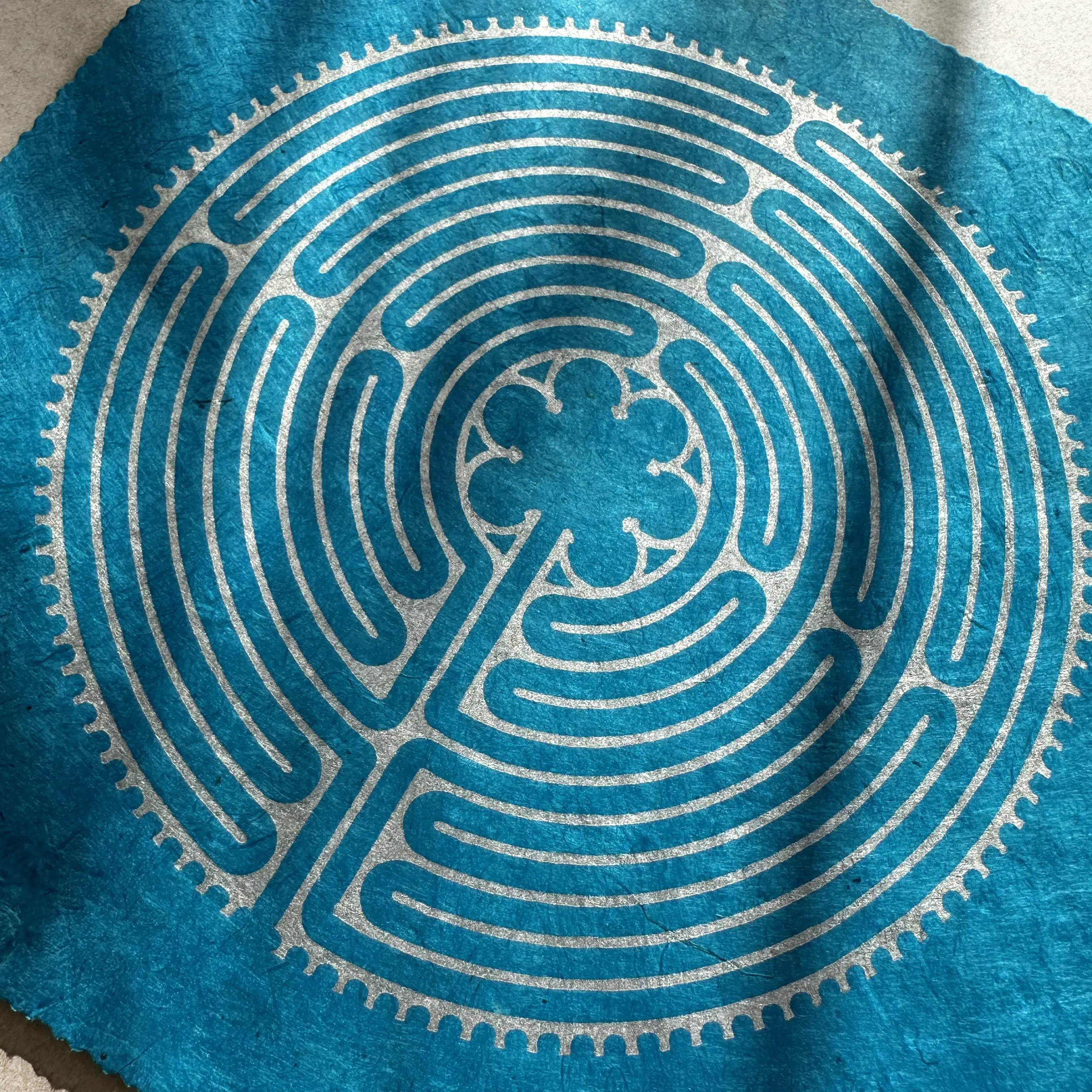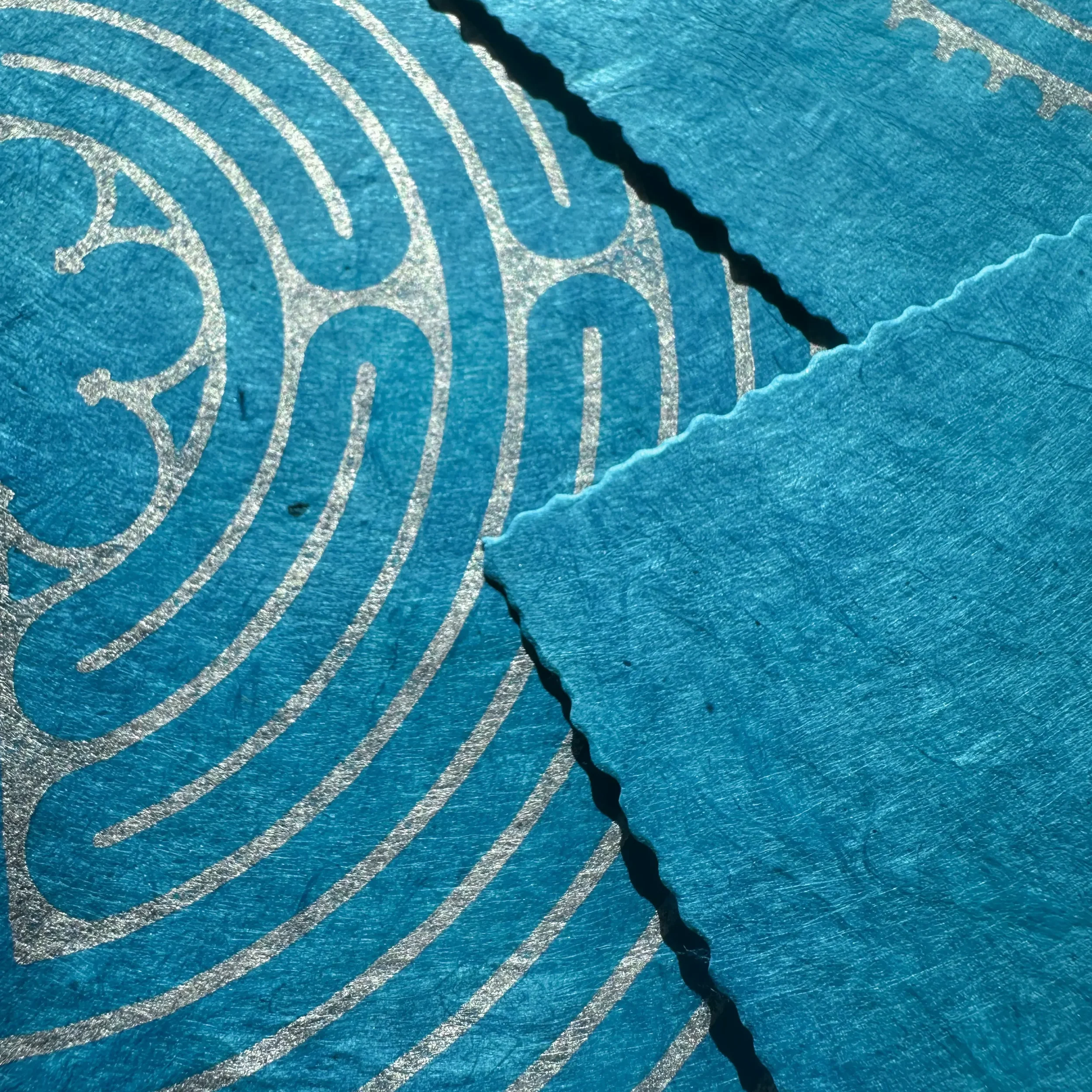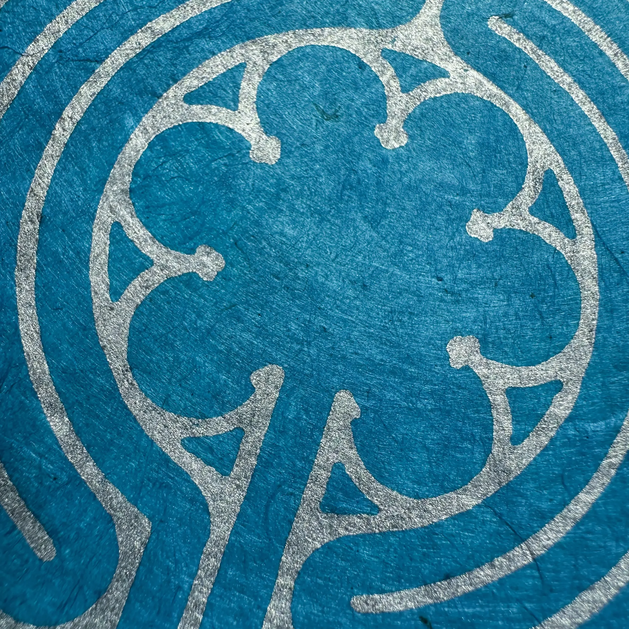 Der Kontrast zwischen kühlem Silber und dem lebendigen Cyanblau des Loktapapiers verleiht dem Motiv eine moderne Brillanz. Das 60 g/m² leichte Papier aus dem Himalaya ist ein nachhaltiges Naturprodukt, das durch seine Robustheit und Einzigartigkeit besticht. Die silberne Ölfarbe fängt das Licht subtil ein und lässt die filigranen Linien des handgeschnitzten Motivs präzise hervortreten.