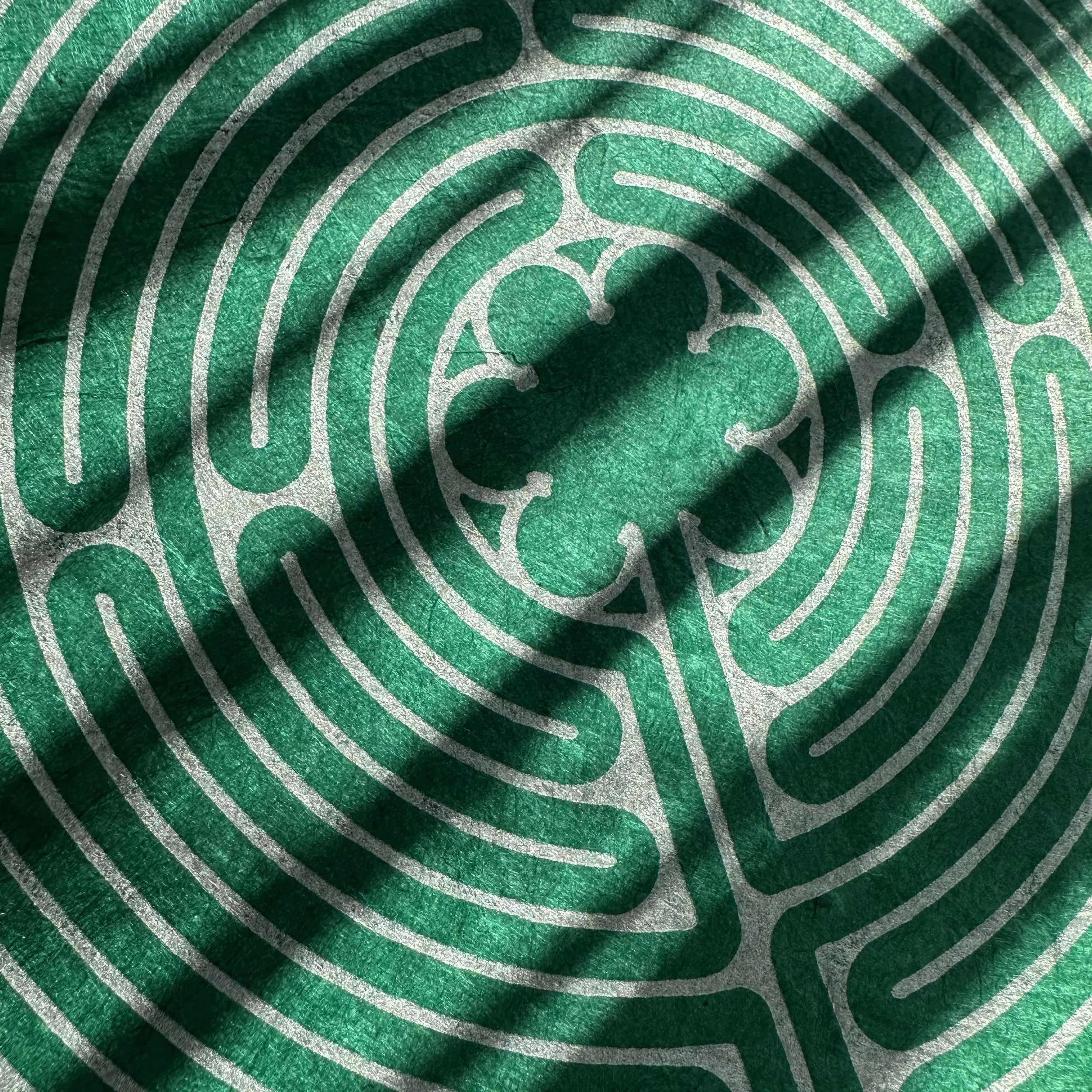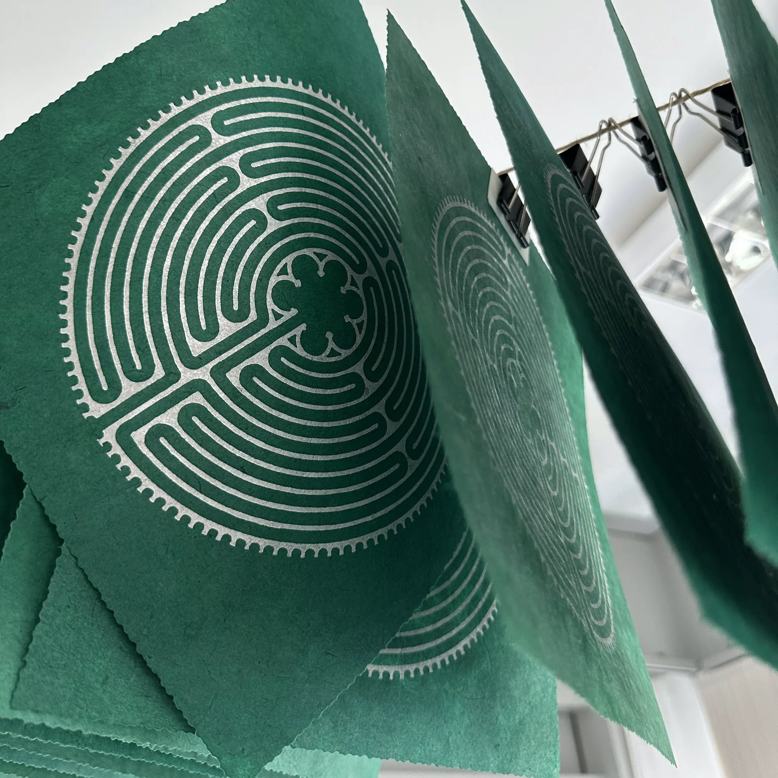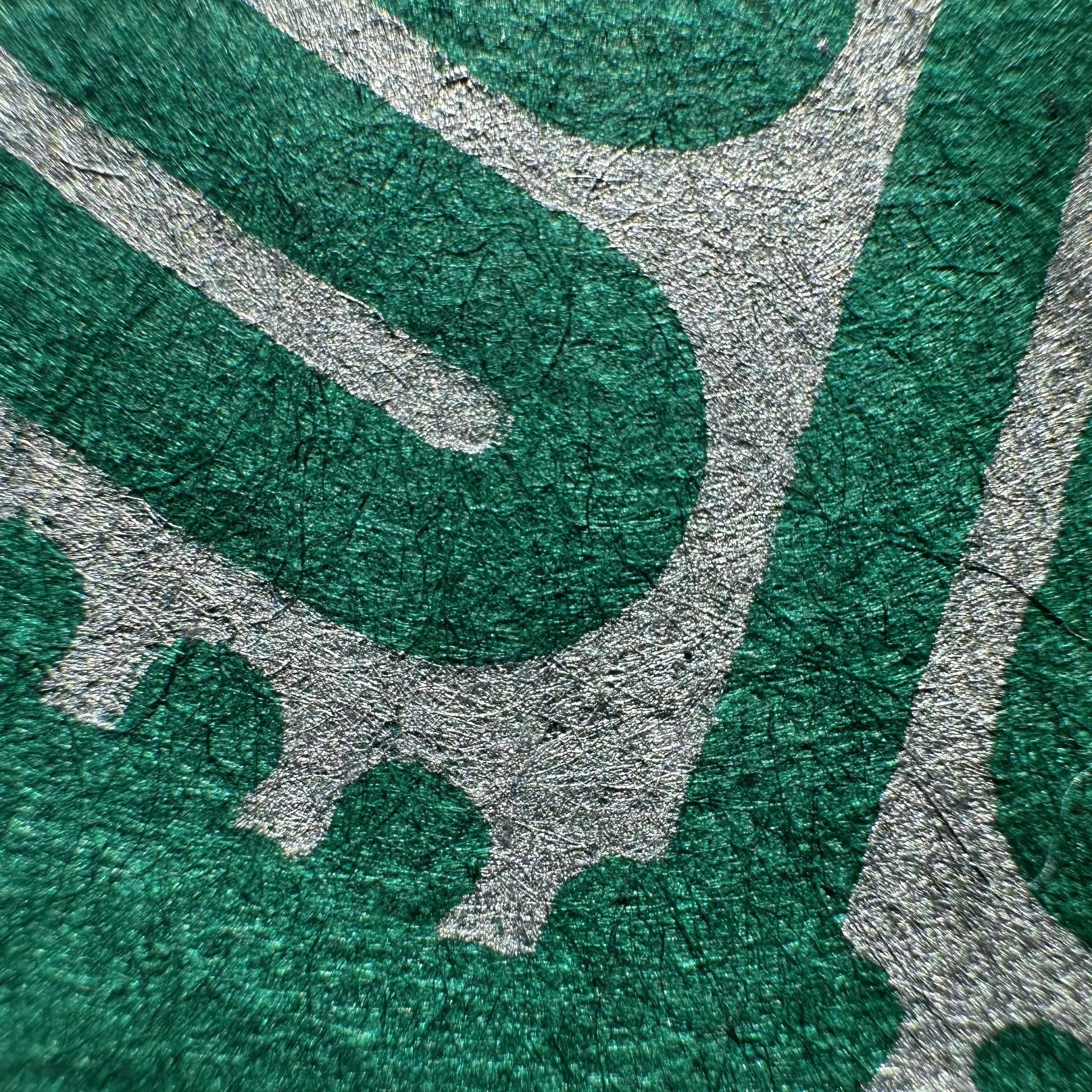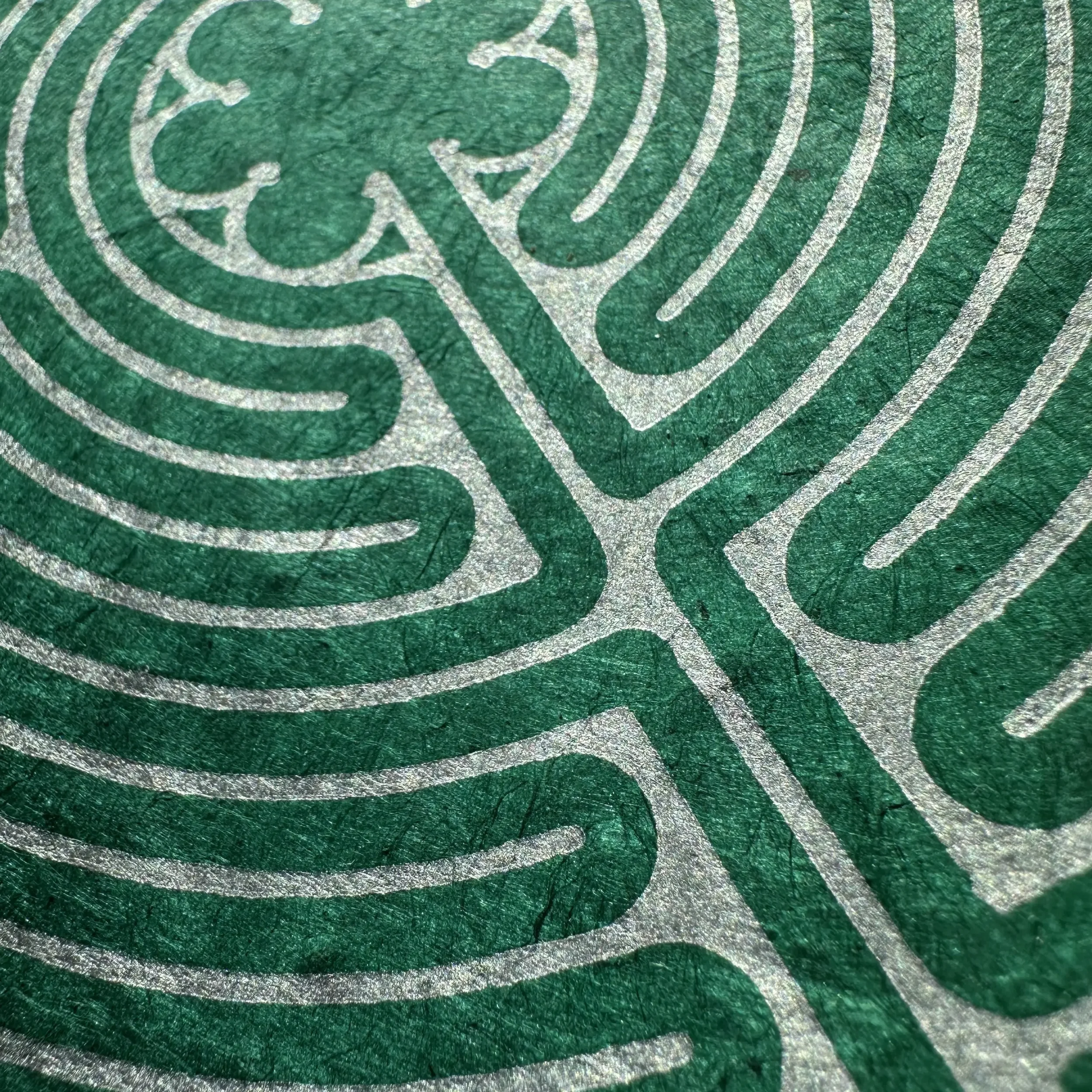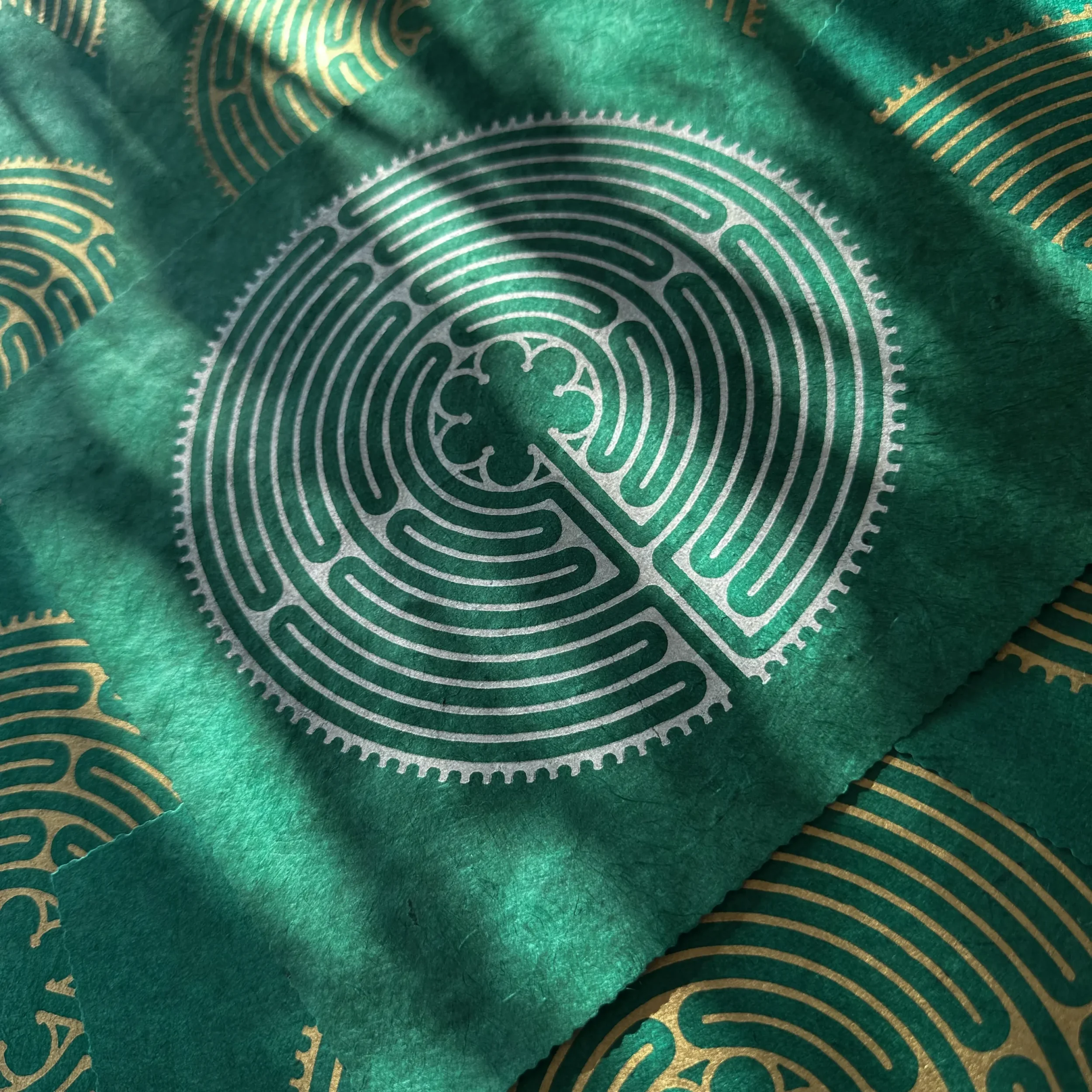 Diese Variante besticht durch den kühlen Kontrast von Silber auf dem intensiven Smaragdgrün des Loktapapiers. Die silberne Farbe fängt das Licht subtil ein und lässt die geometrische Präzision des Labyrinths klar hervortreten. Das Papier wird im Himalaya nach jahrhundertealter Tradition aus dem nachwachsenden Seidelbast handgeschöpft. Dieser nachhaltige Prozess bleibt im Einklang mit der Natur – ein Wert, der mir bei meiner künstlerischen Arbeit sehr am Herzen liegt.