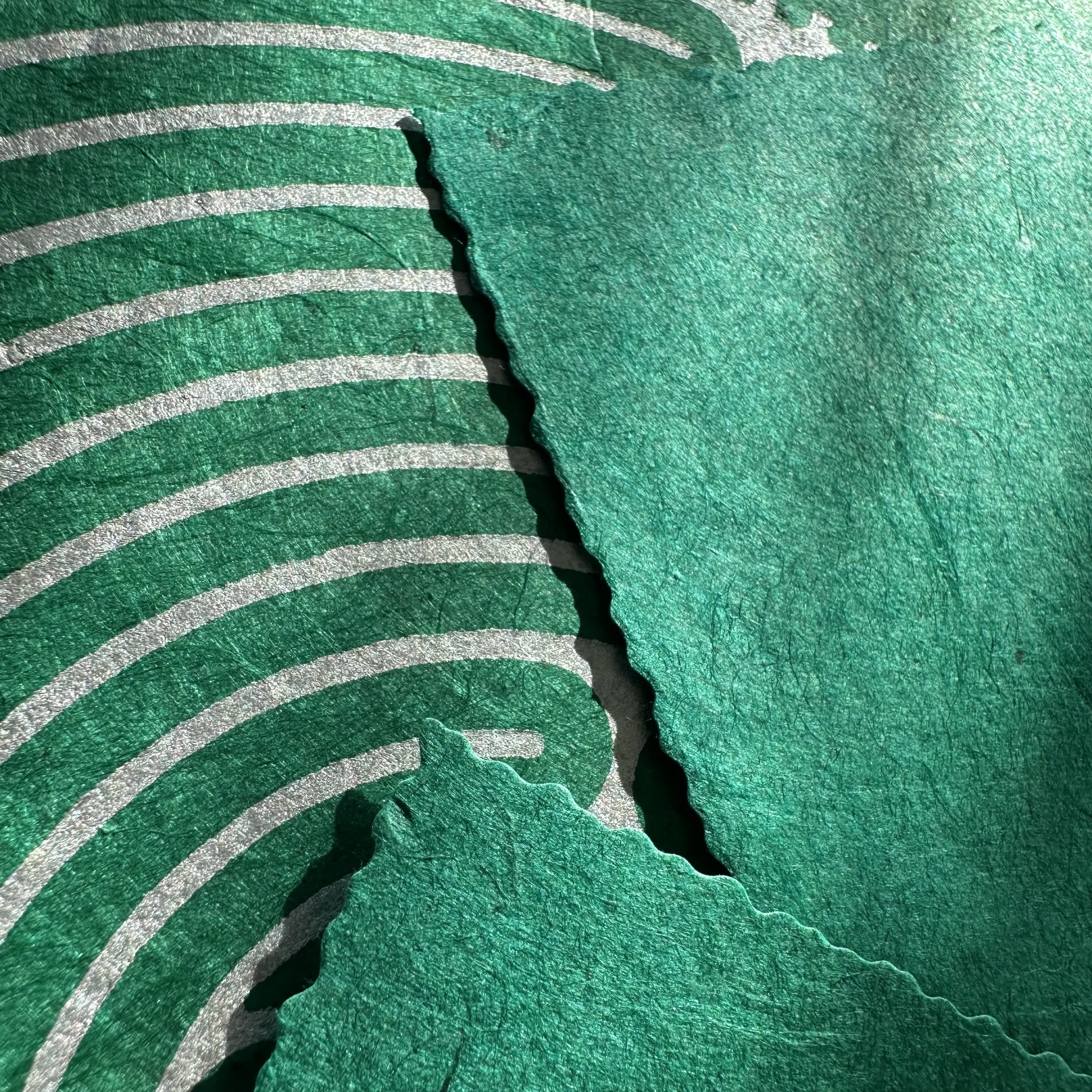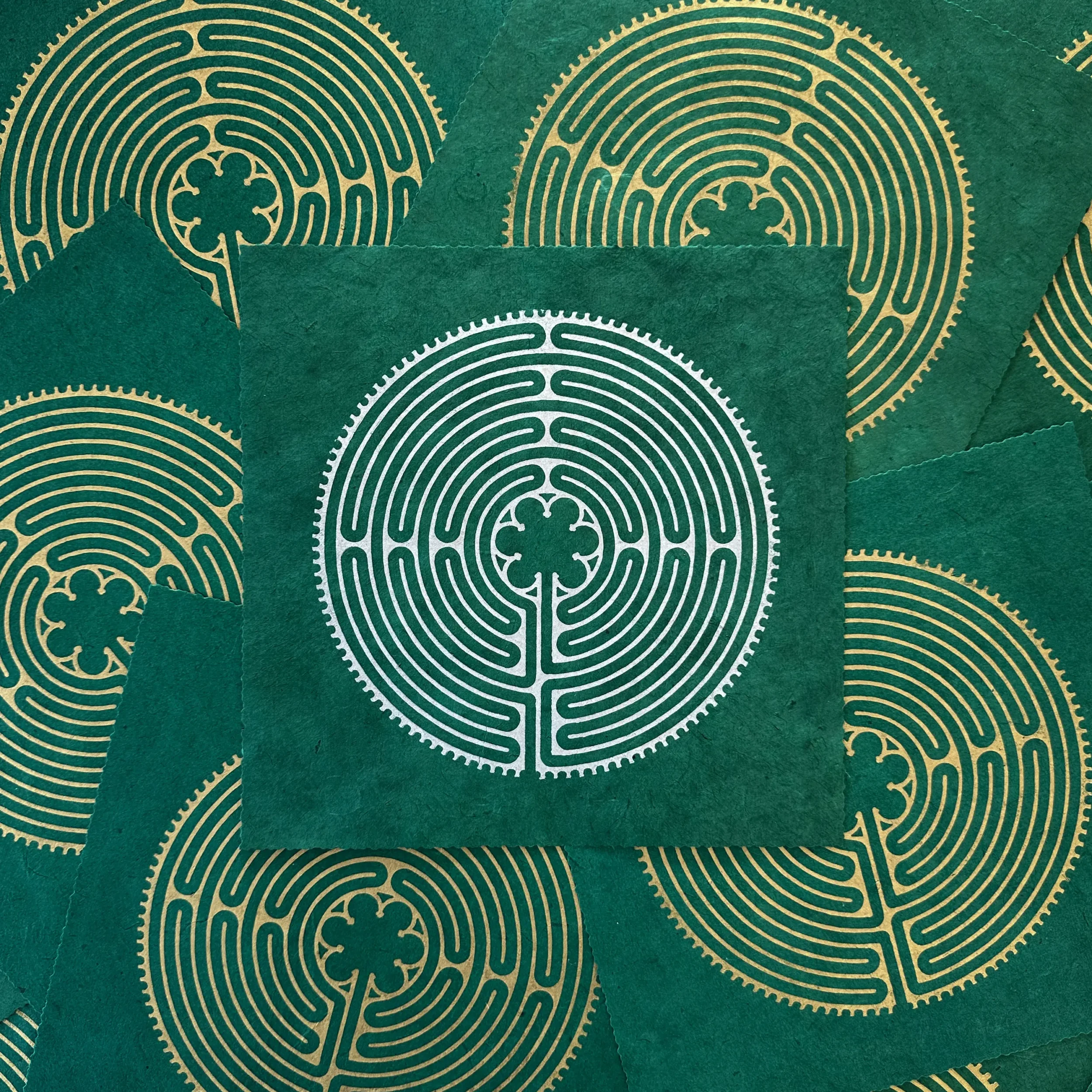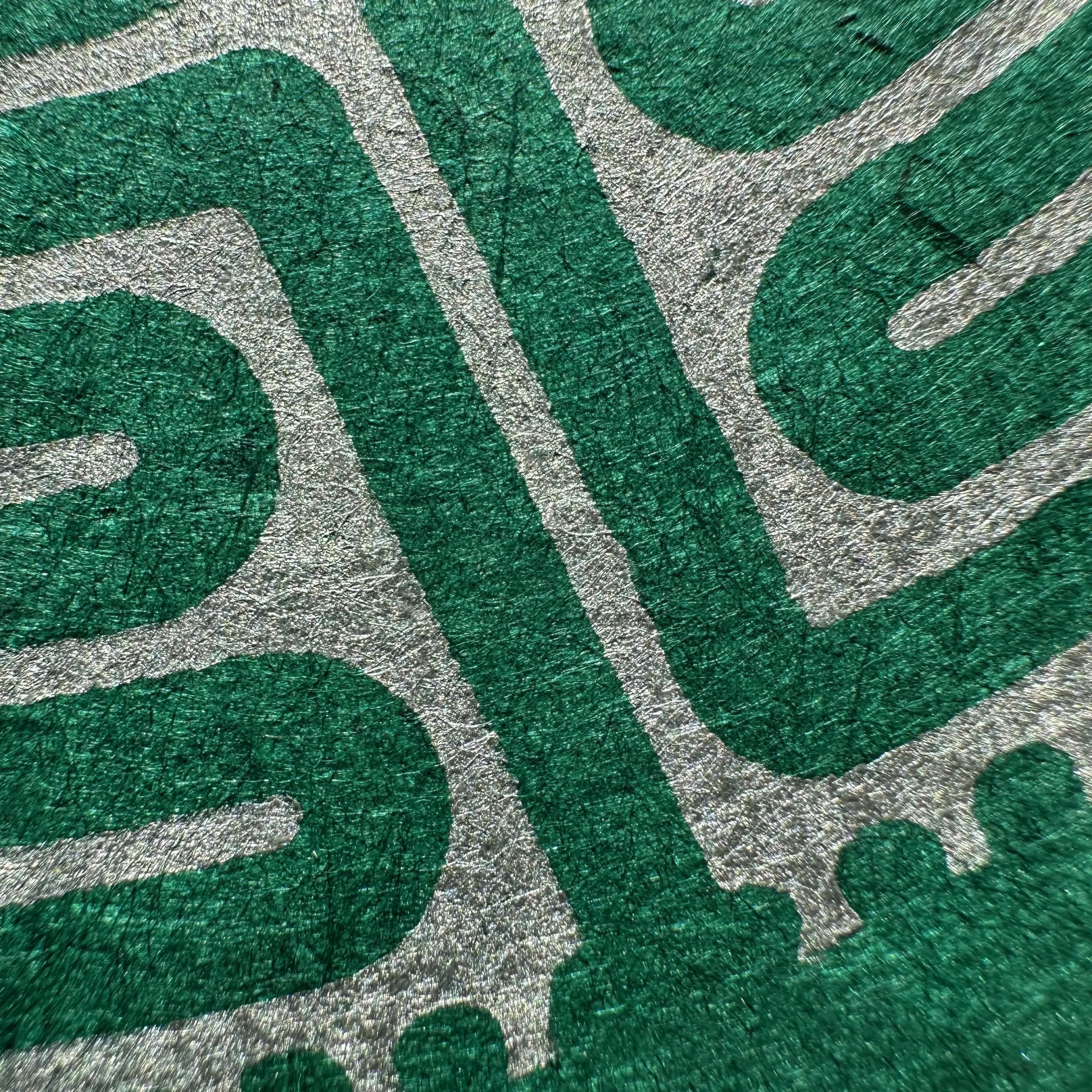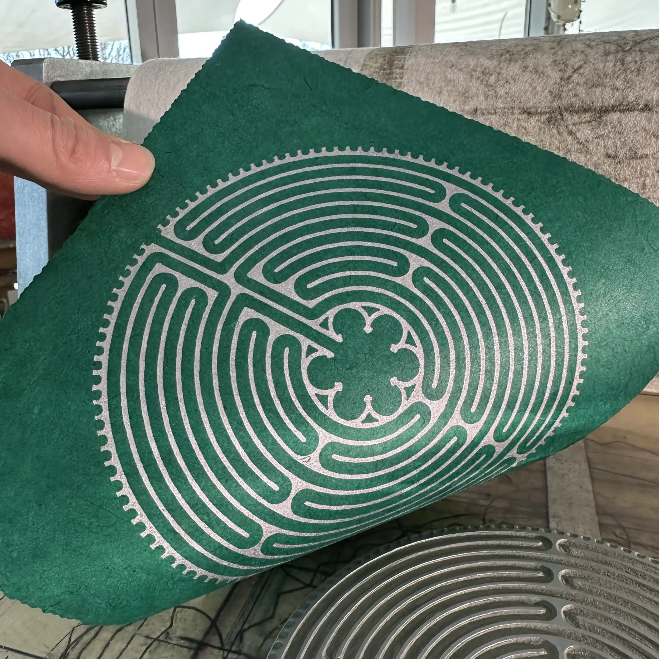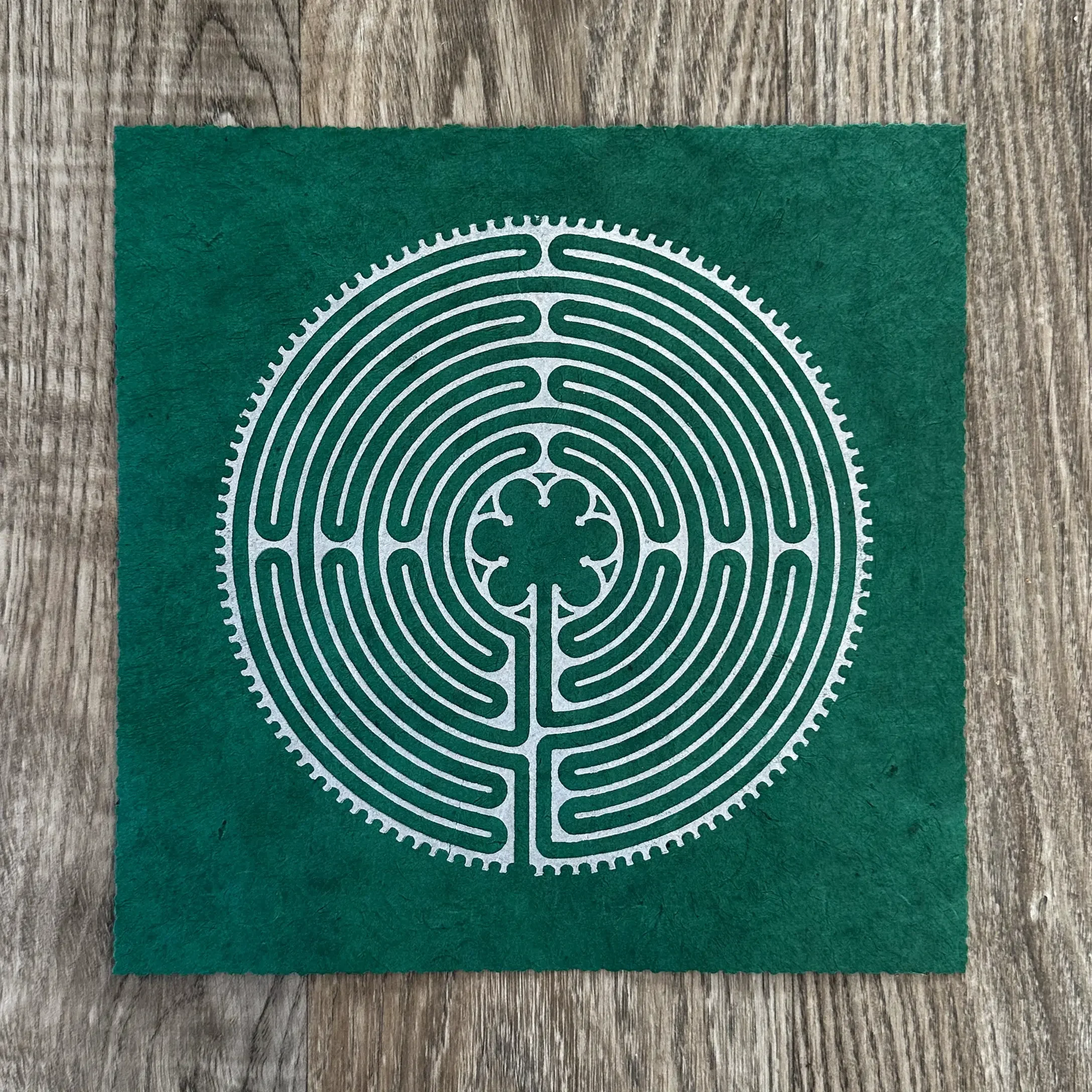 Diese Variante besticht durch den kühlen Kontrast von Silber auf dem intensiven Smaragdgrün des Loktapapiers. Die silberne Farbe fängt das Licht subtil ein und lässt die geometrische Präzision des Labyrinths klar hervortreten. Das Papier wird im Himalaya nach jahrhundertealter Tradition aus dem nachwachsenden Seidelbast handgeschöpft. Dieser nachhaltige Prozess bleibt im Einklang mit der Natur – ein Wert, der mir bei meiner künstlerischen Arbeit sehr am Herzen liegt.