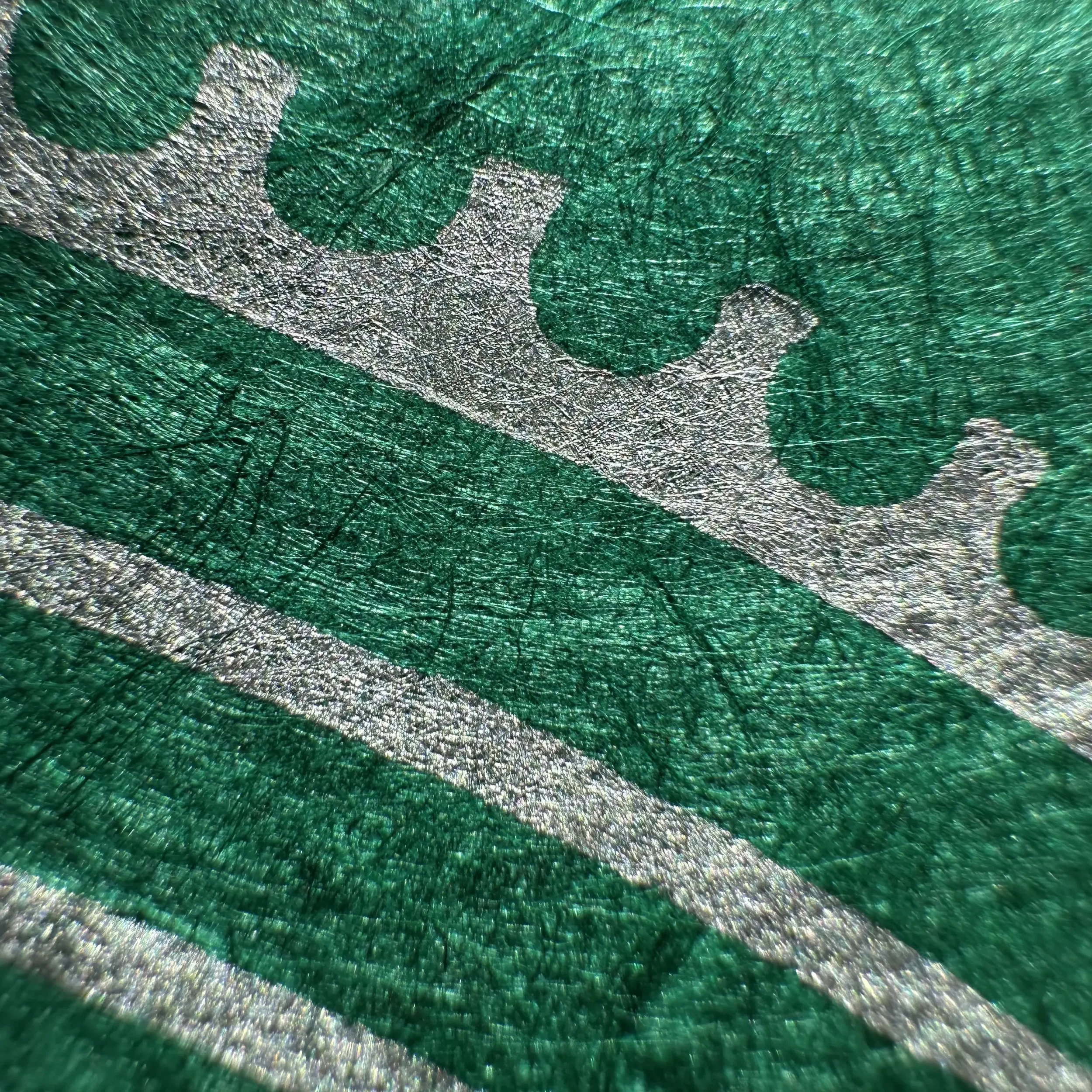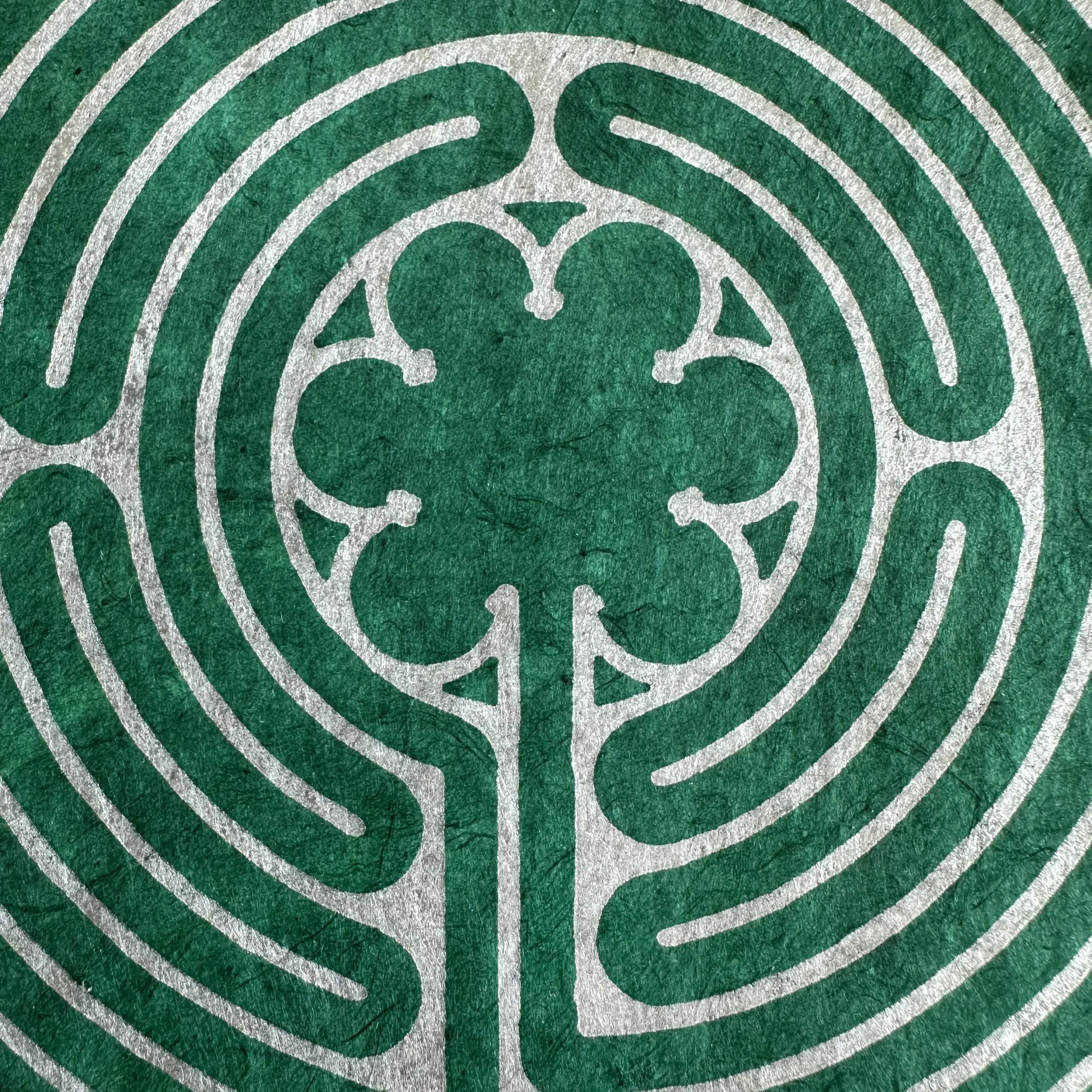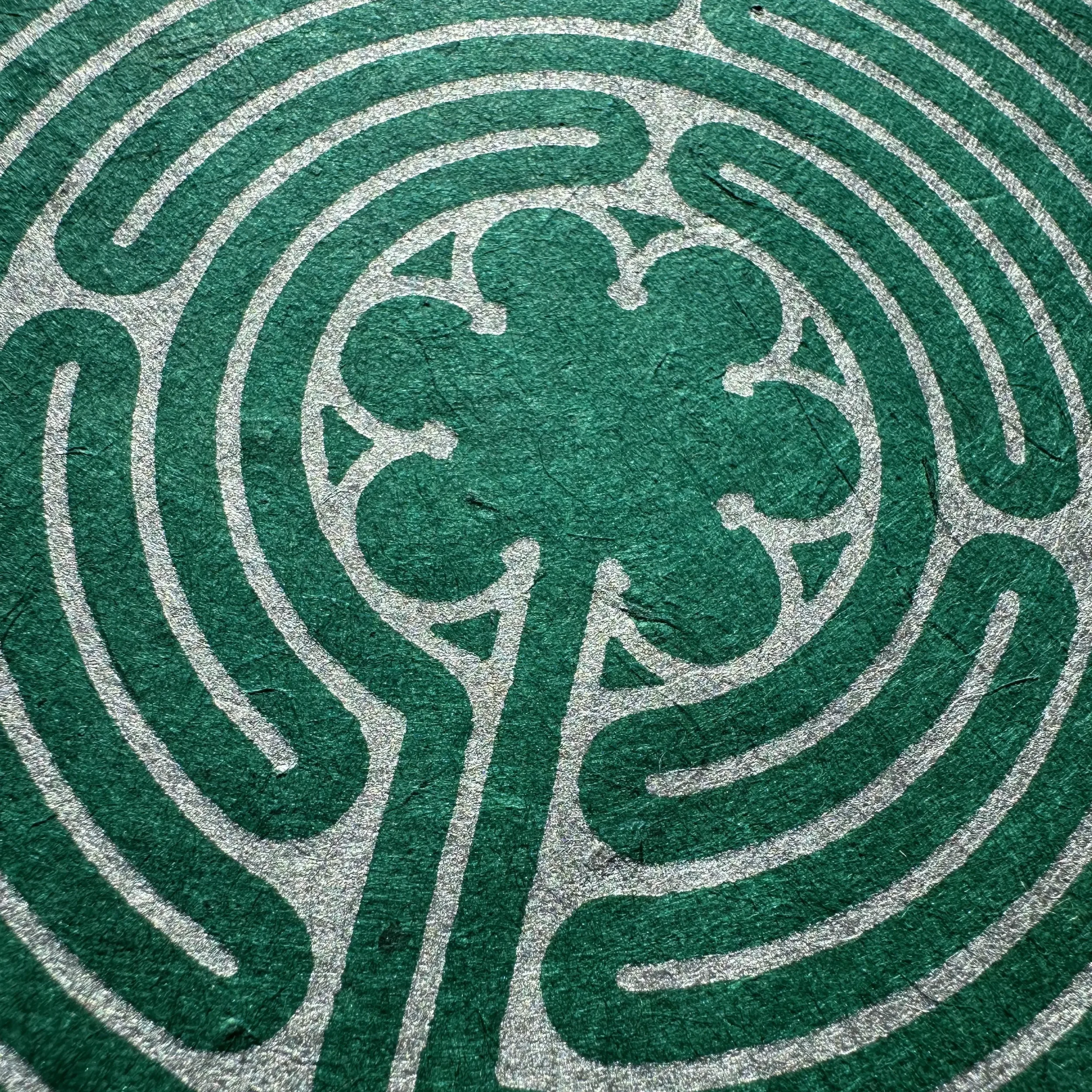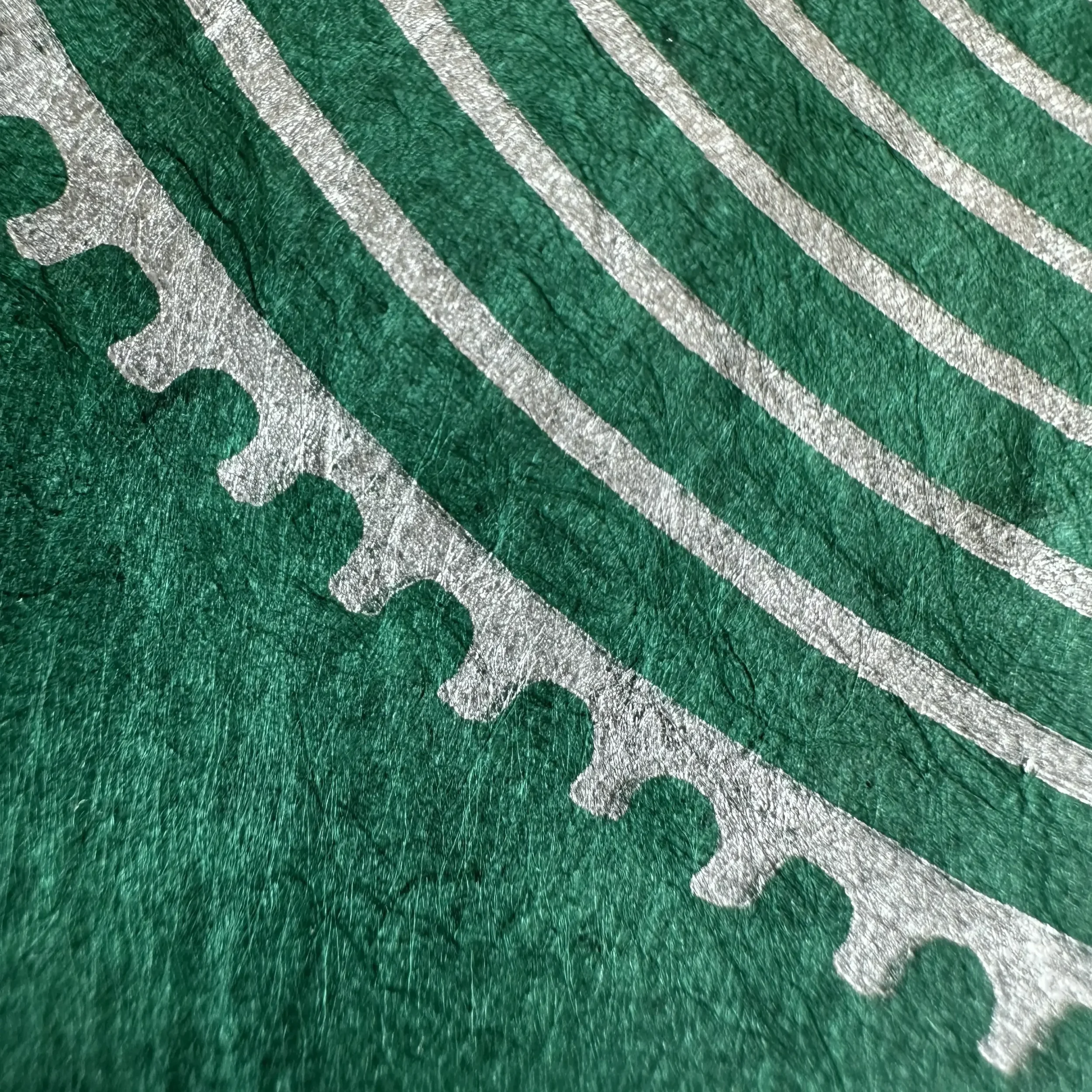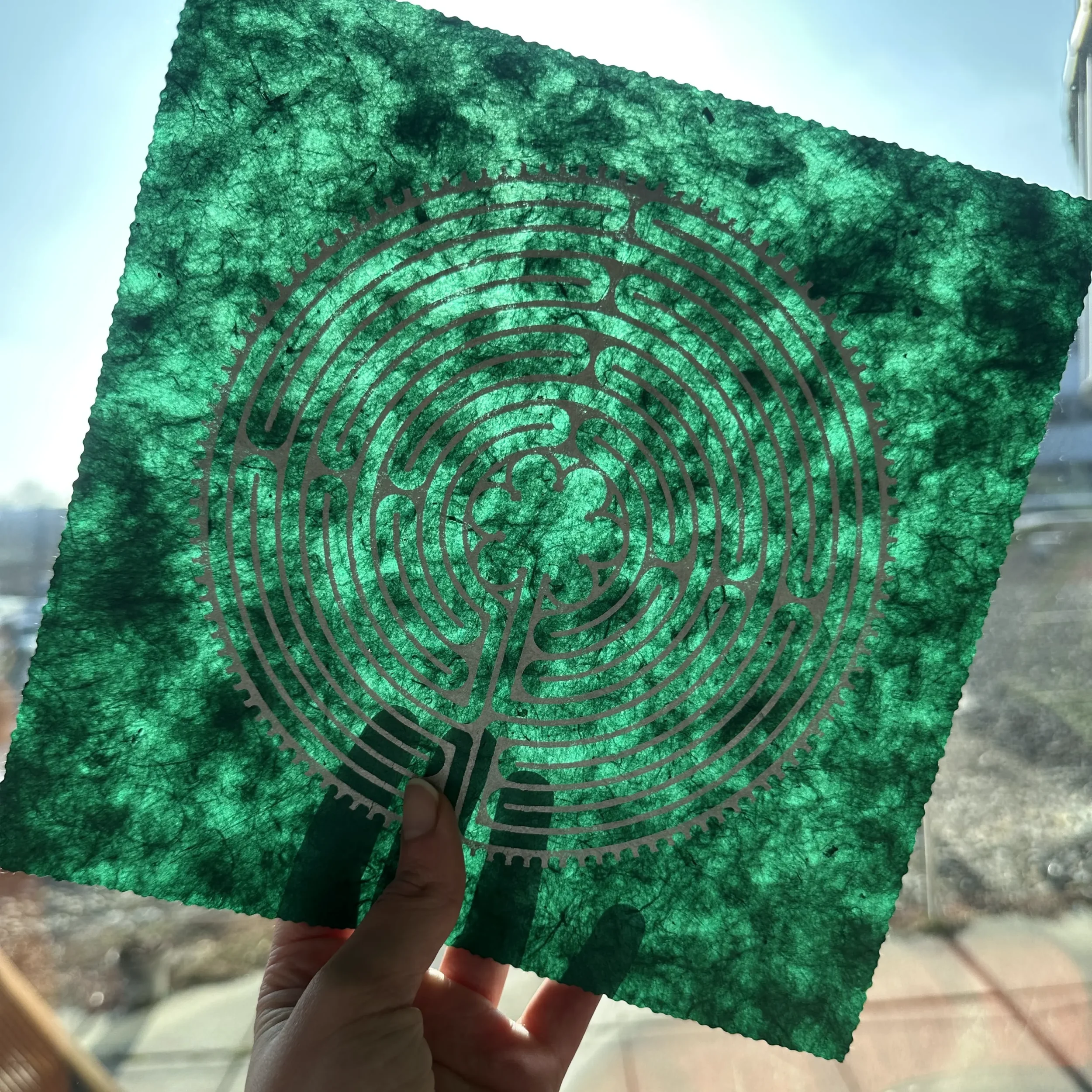 Diese Variante besticht durch den kühlen Kontrast von Silber auf dem intensiven Smaragdgrün des Loktapapiers. Die silberne Farbe fängt das Licht subtil ein und lässt die geometrische Präzision des Labyrinths klar hervortreten. Das Papier wird im Himalaya nach jahrhundertealter Tradition aus dem nachwachsenden Seidelbast handgeschöpft. Dieser nachhaltige Prozess bleibt im Einklang mit der Natur – ein Wert, der mir bei meiner künstlerischen Arbeit sehr am Herzen liegt.