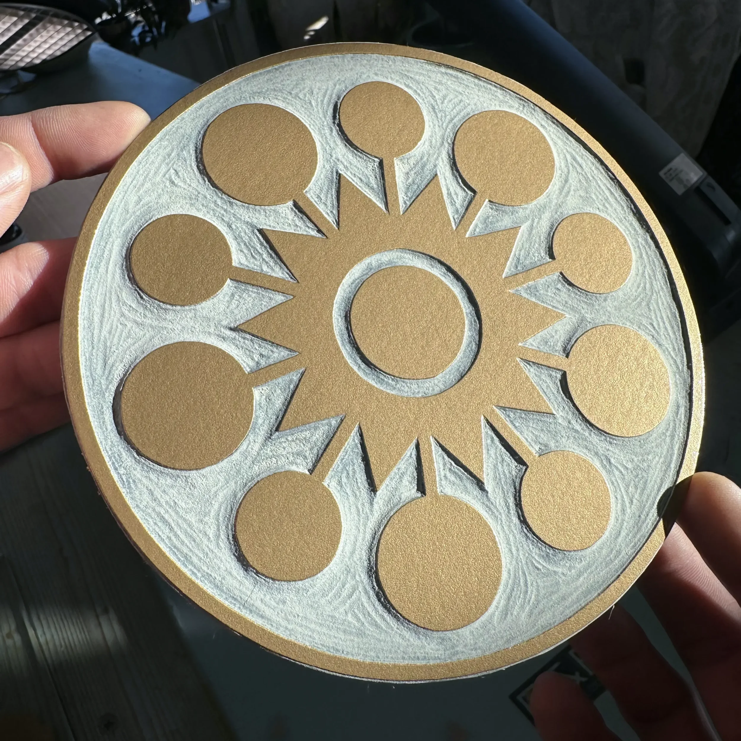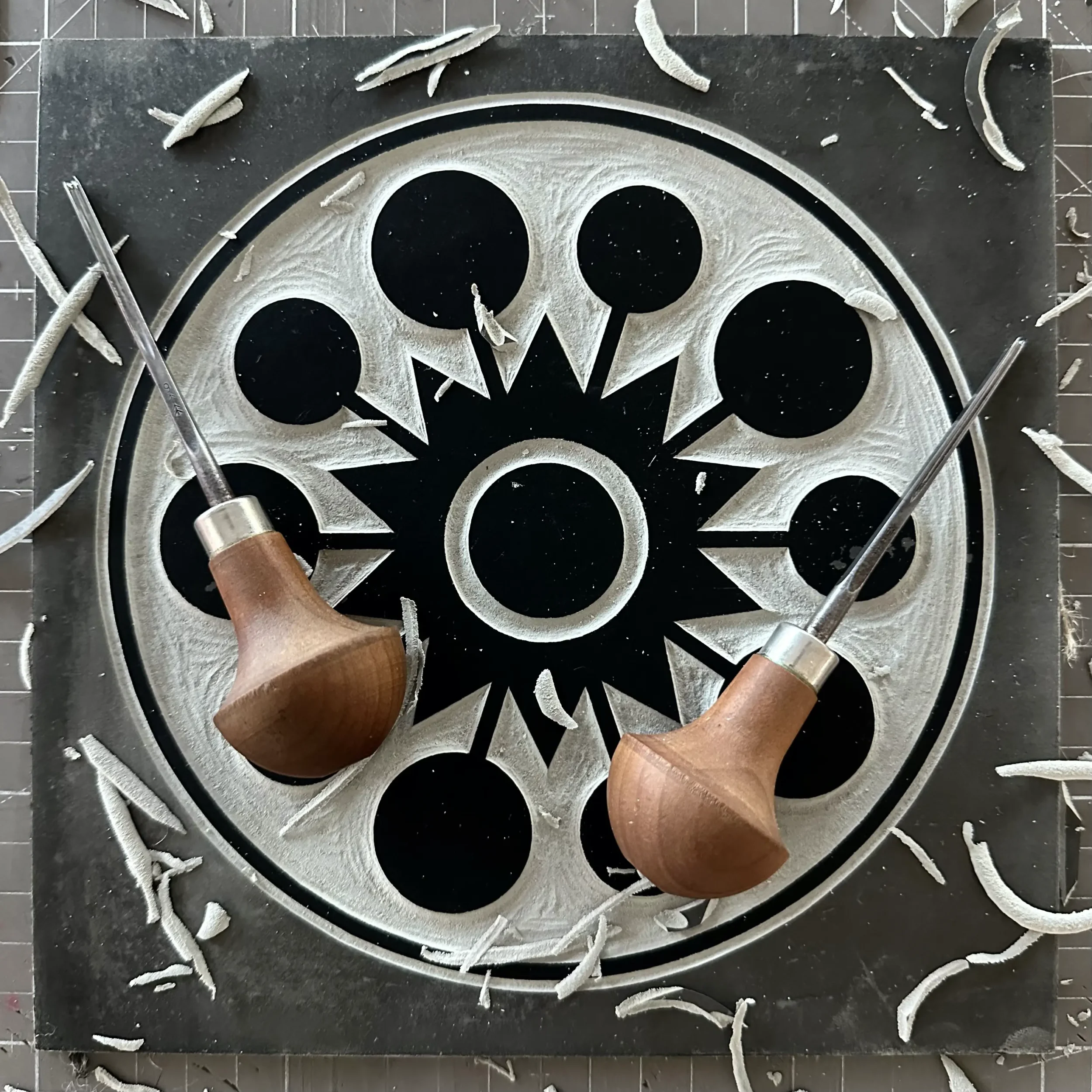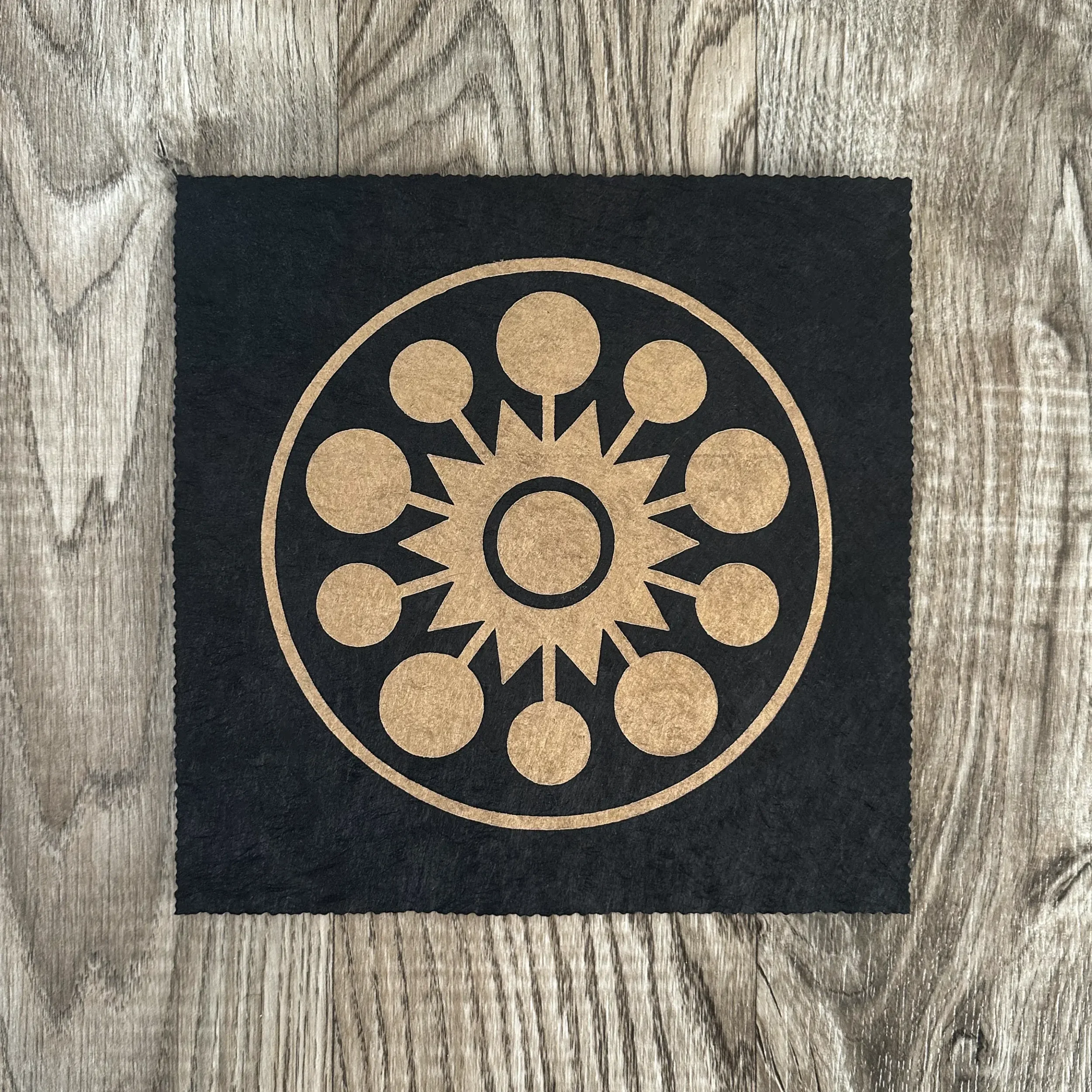 Dieser Linoldruck zeigt die kraftvolle Geometrie des Kornkreises „Falkner’s Circle“, der im Sommer 2025 unmittelbar neben den Megalith-Ruinen von Avebury auftauchte. Die Formation zeigt ein „Explosions-Icon“ in Form eines zehnstrahligen Sterns, umringt von zehn Sphären, die wie Planeten um ein feuriges Zentrum angeordnet sind. Auf dem tiefschwarzen Papier entfaltet das Motiv eine mystische Strahlkraft und erinnert an eine solare Eruption in der Unendlichkeit des Weltraums – ein Symbol für den Übergang in ein neues Zeitalter und die energetische Verbindung zum Kosmos.
