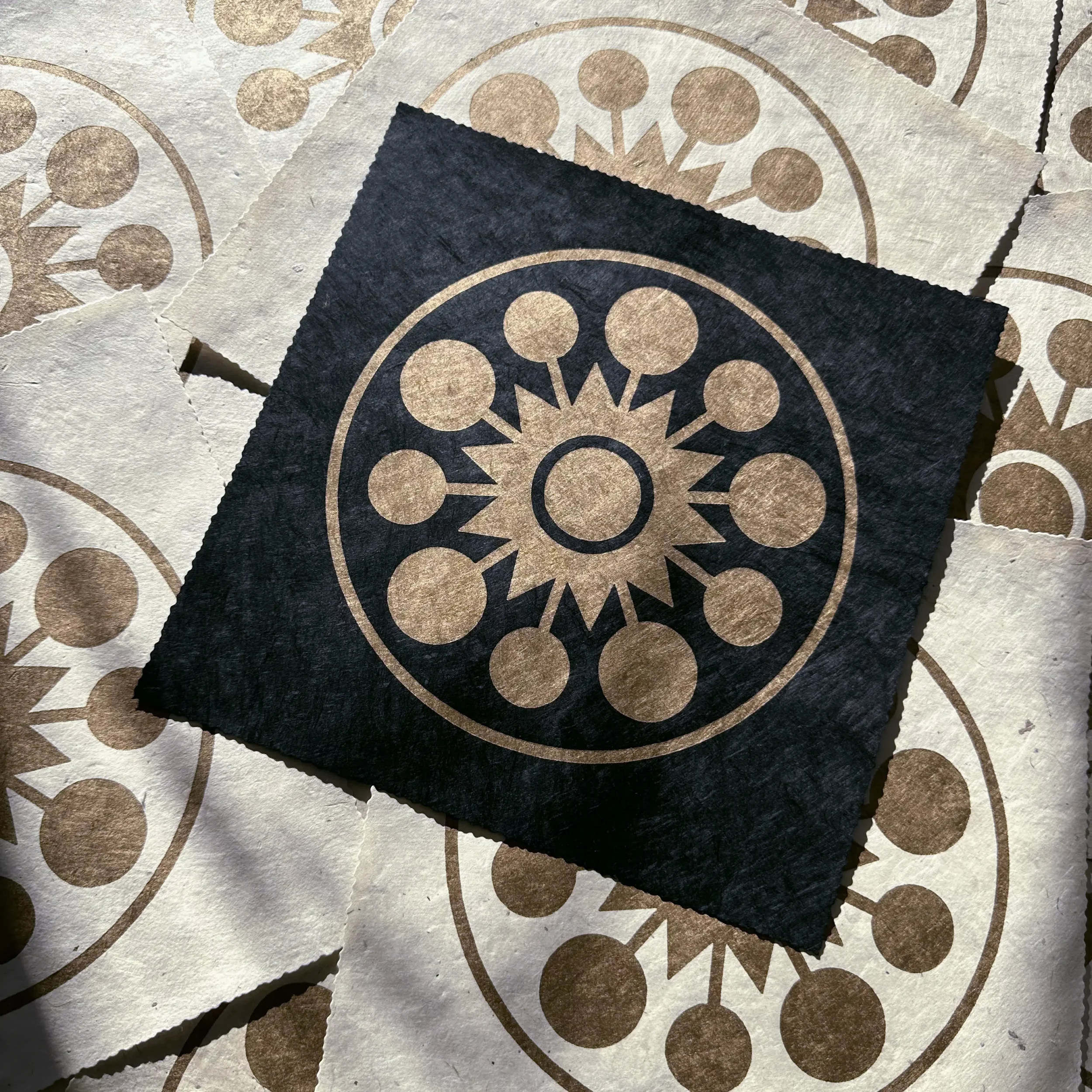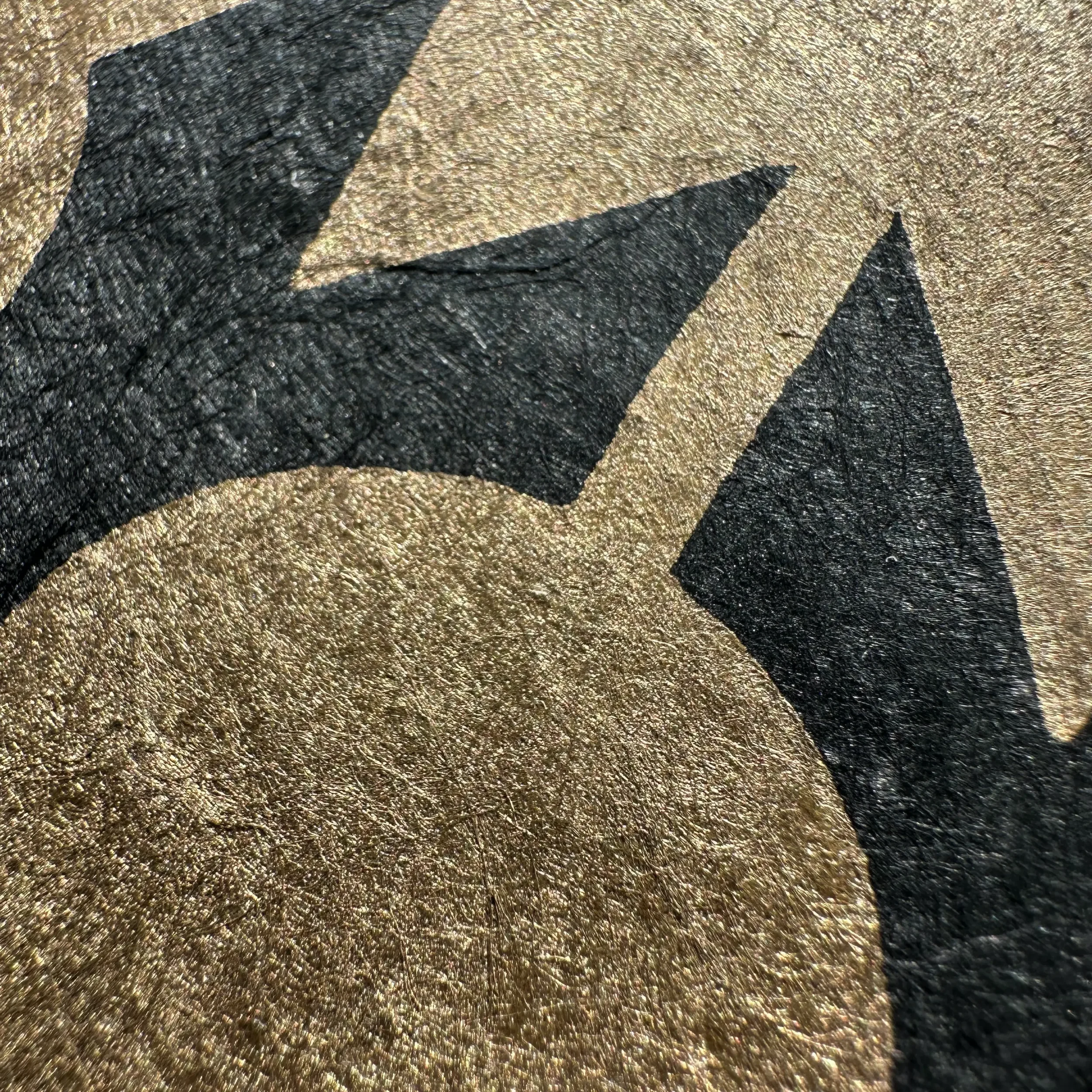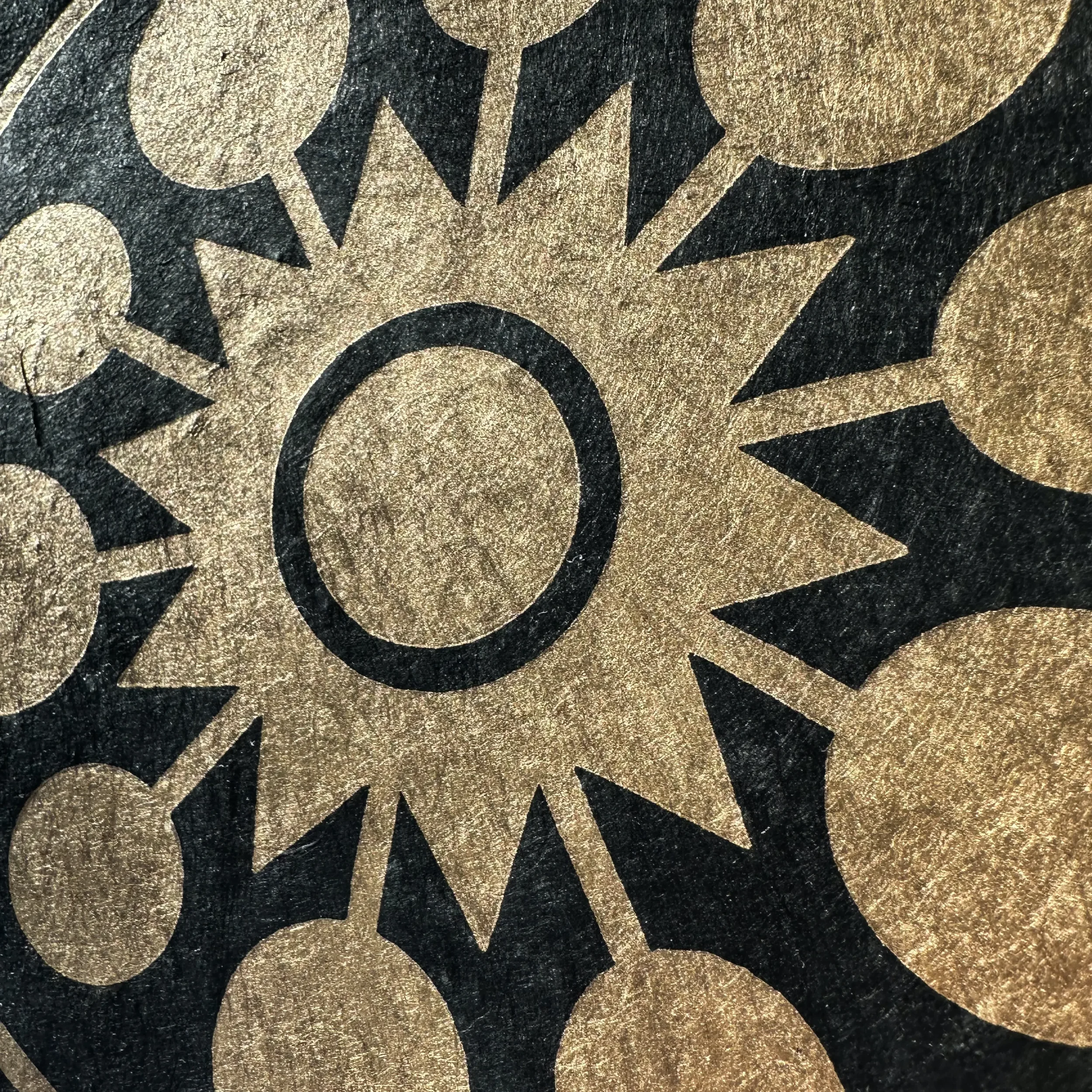 Für diese Edition verwende ich schwarzes Loktapapier aus dem Himalaya, das trotz seiner filigranen Struktur extrem langlebig und alterungsbeständig ist. Der starke Kontrast zwischen dem dunklen Grund und der metallischen, ölbasierten Goldfarbe lässt die heilige Geometrie förmlich leuchten. Es ist ein kraftvolles Energiebild, das besonders in modernen Räumen oder an einem Ort der Meditation eine tiefe visuelle Tiefe erzeugt.