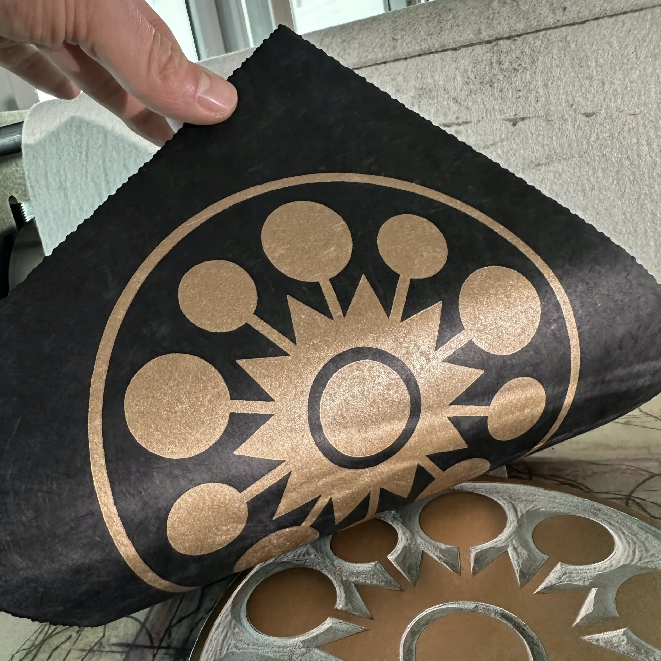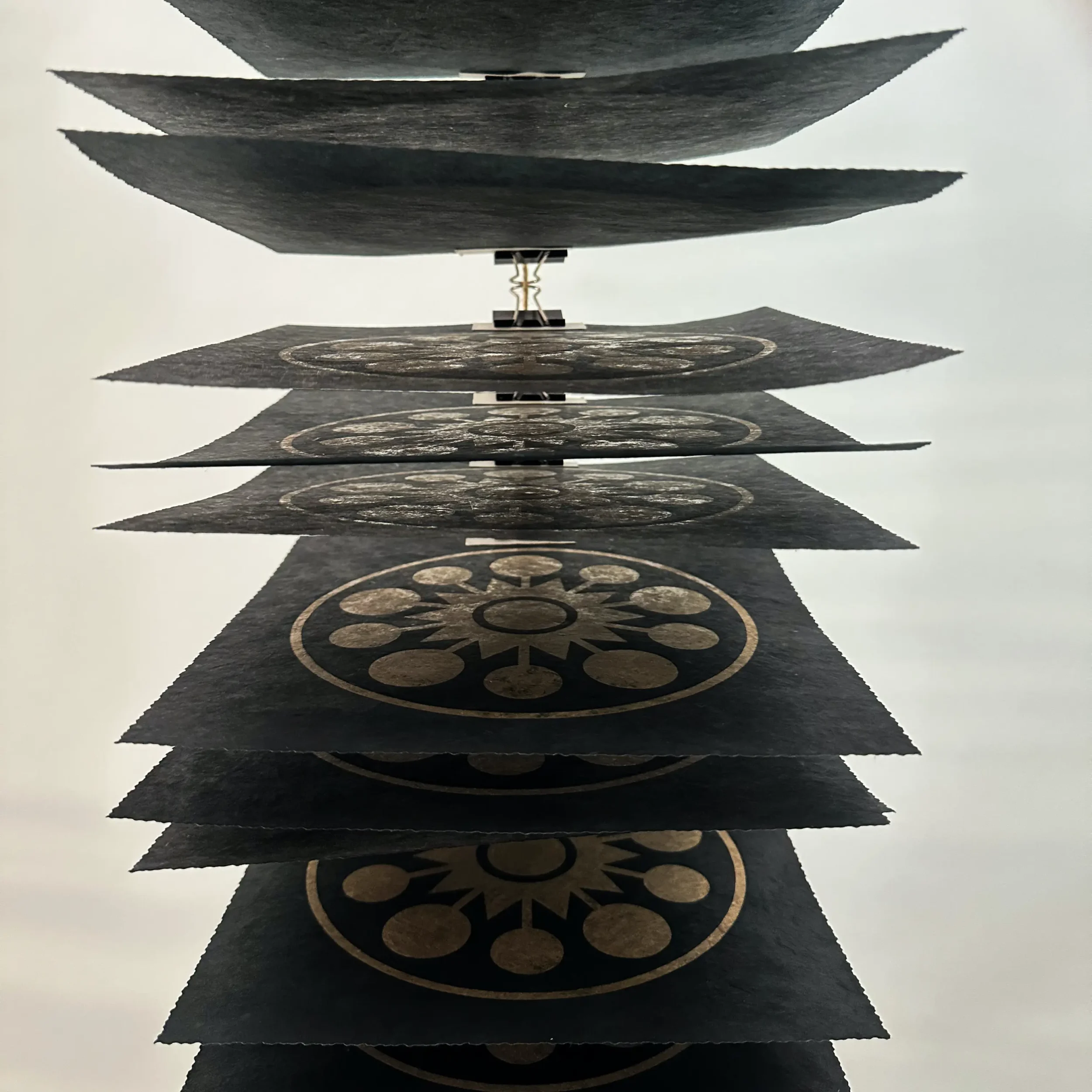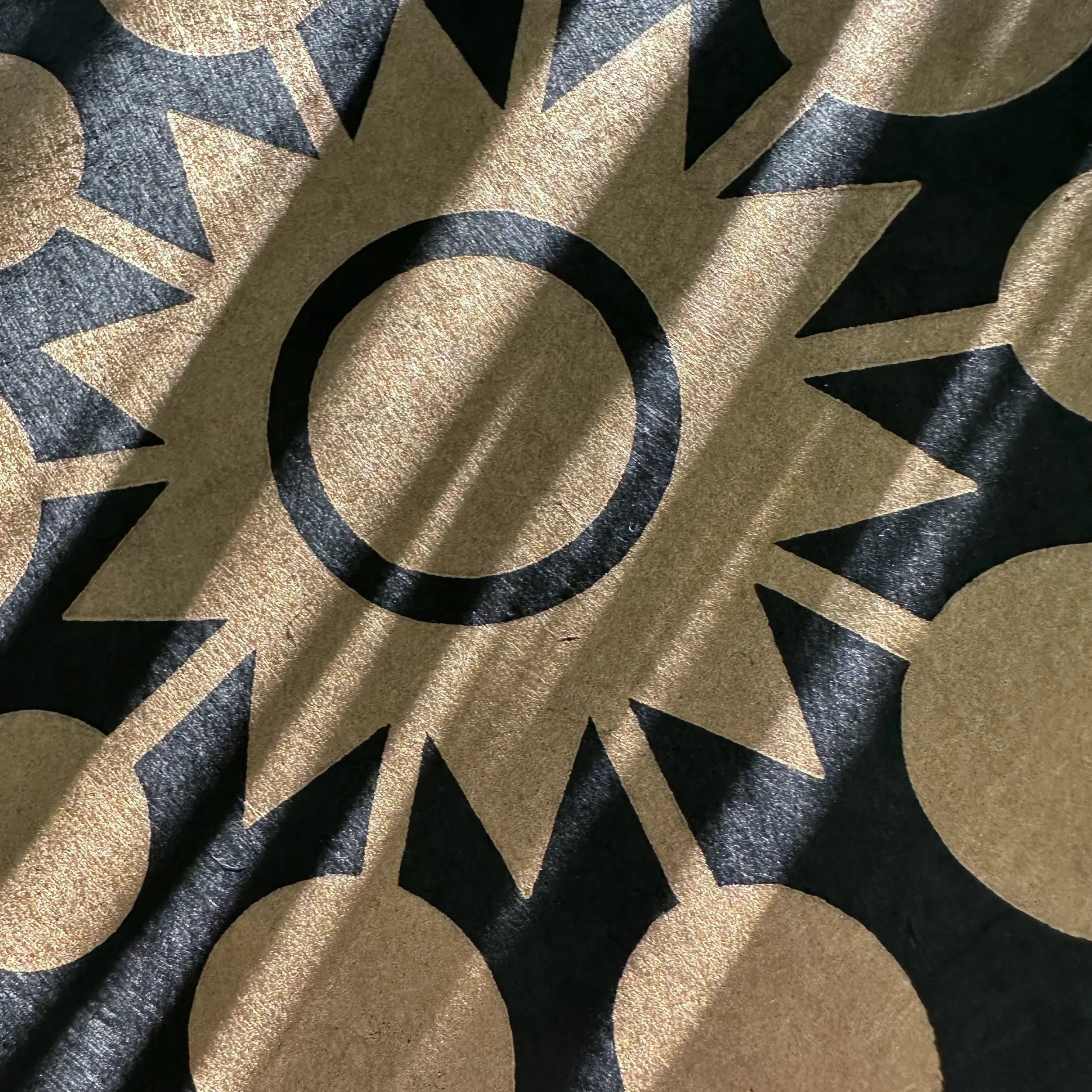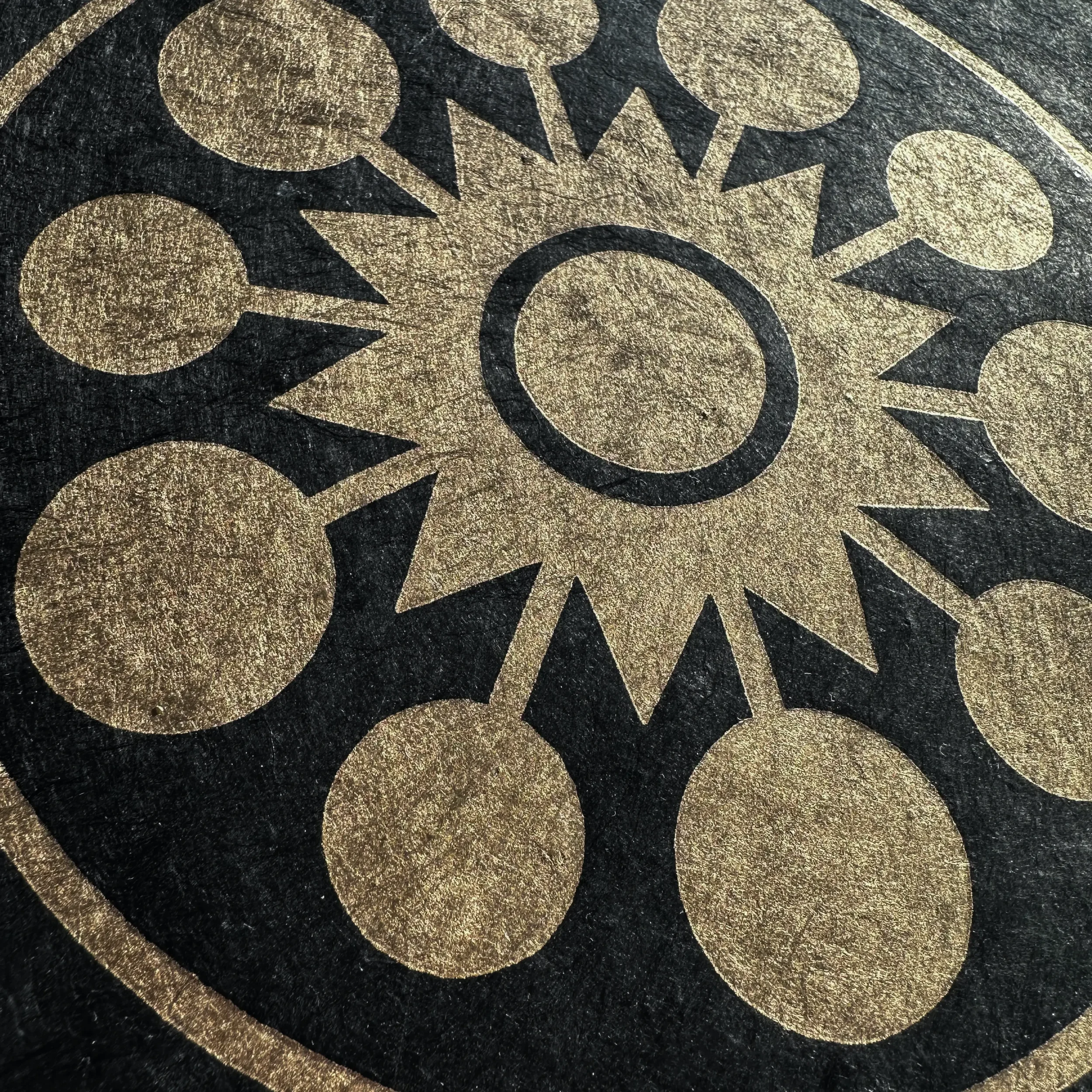 Für diese Edition verwende ich schwarzes Loktapapier aus dem Himalaya, das trotz seiner filigranen Struktur extrem langlebig und alterungsbeständig ist. Der starke Kontrast zwischen dem dunklen Grund und der metallischen, ölbasierten Goldfarbe lässt die heilige Geometrie förmlich leuchten. Es ist ein kraftvolles Energiebild, das besonders in modernen Räumen oder an einem Ort der Meditation eine tiefe visuelle Tiefe erzeugt.