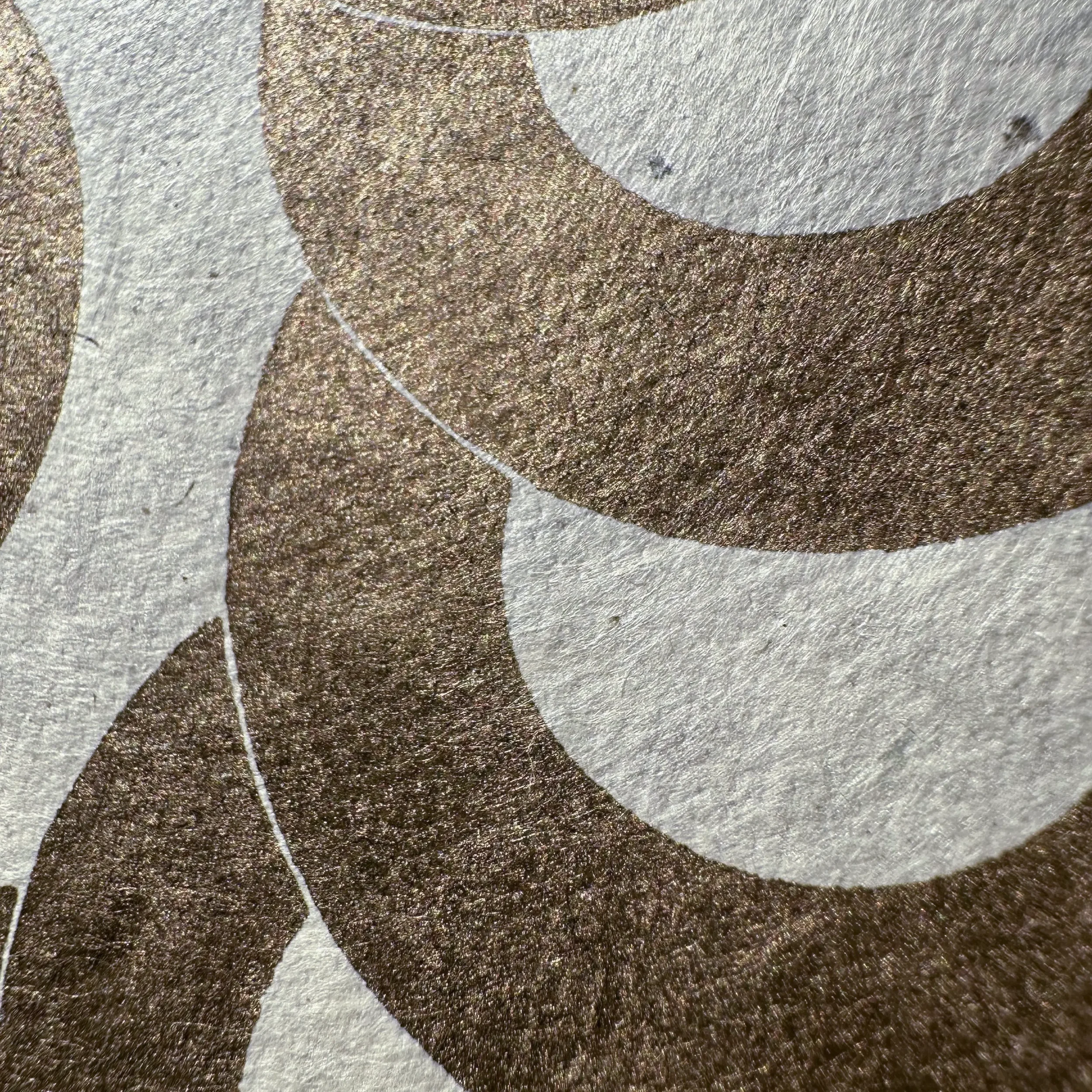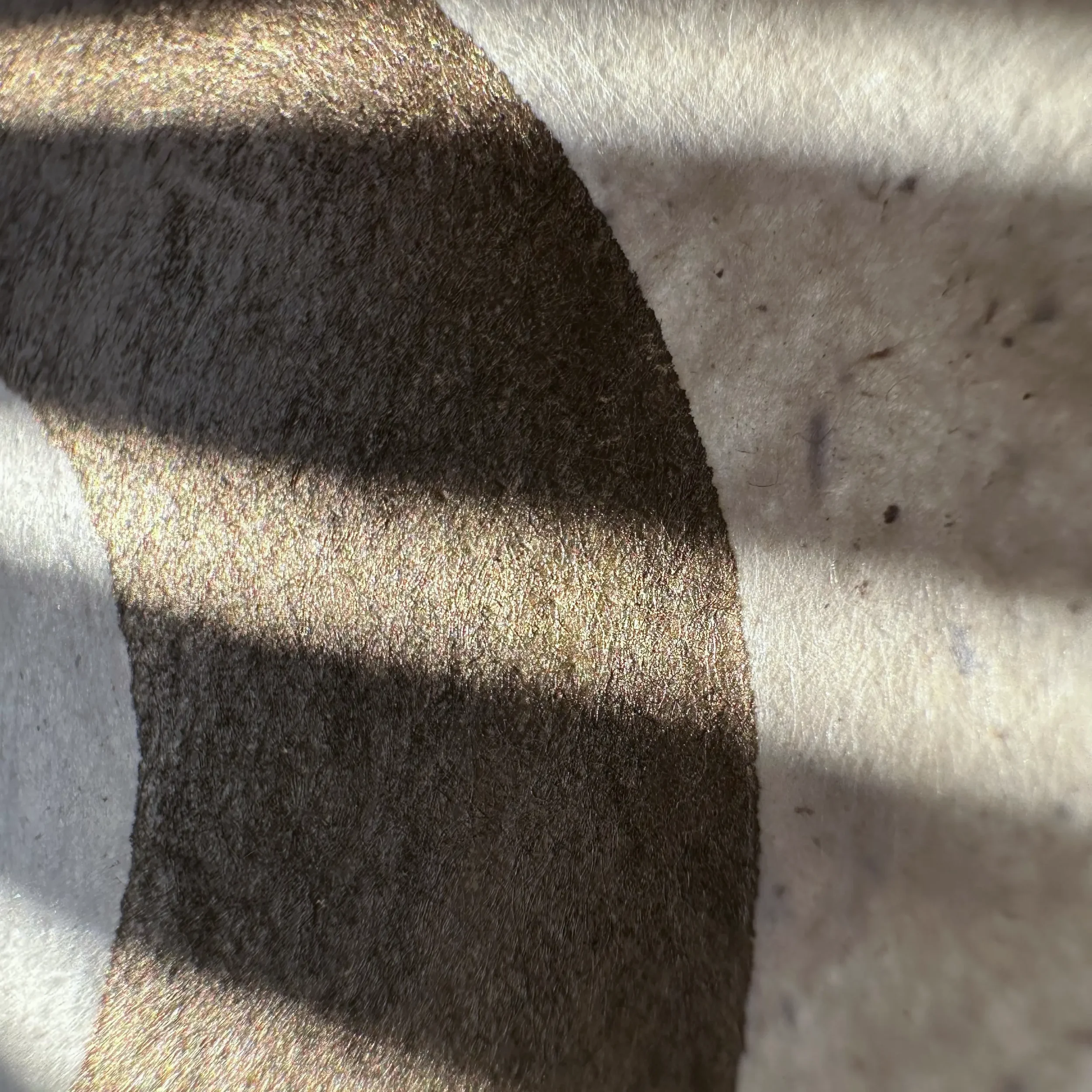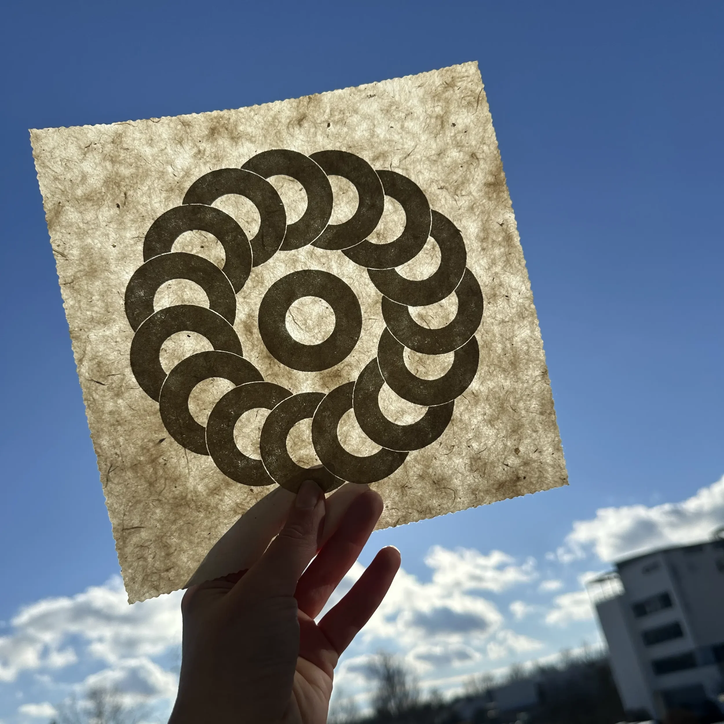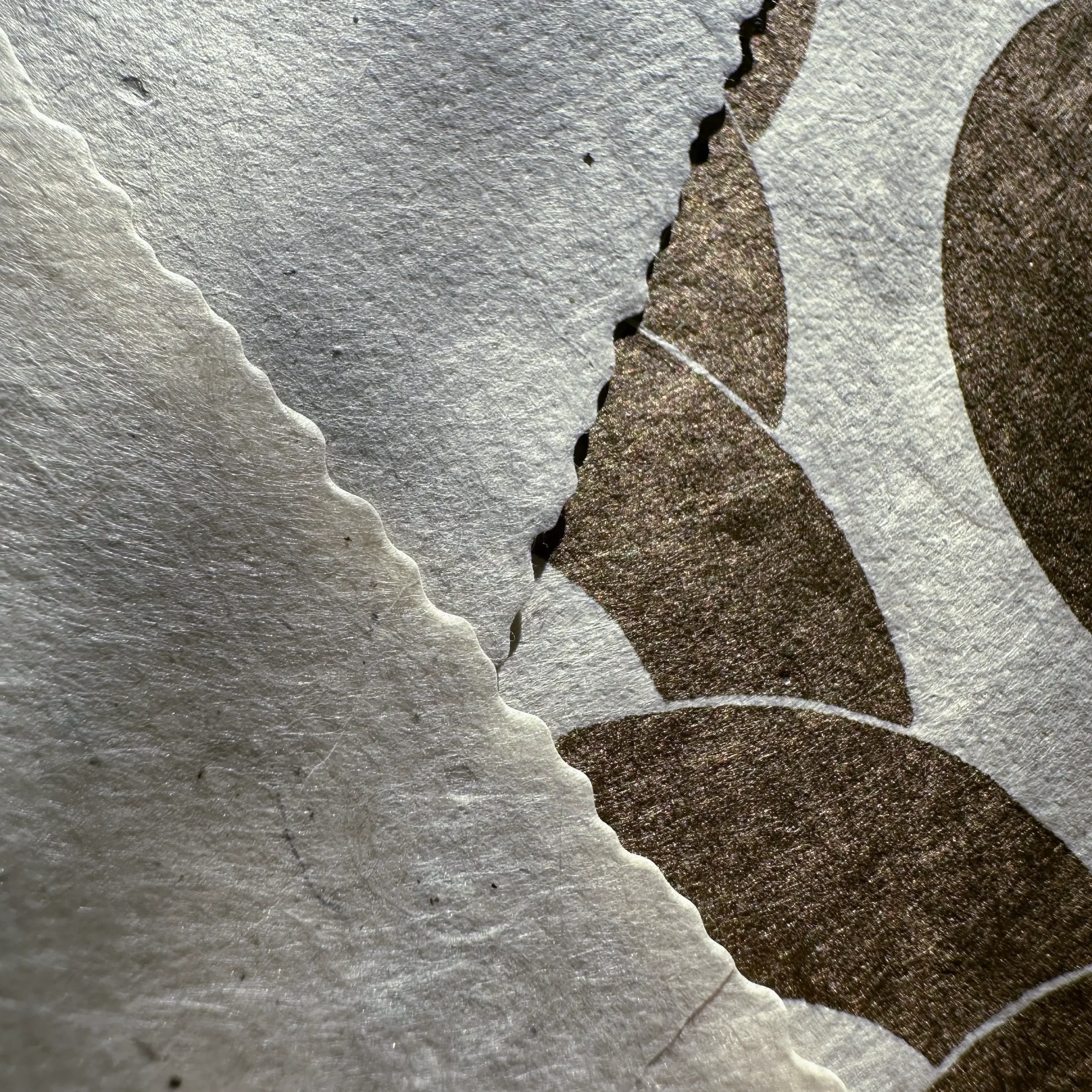 In dieser hellen Edition verwende ich naturbelassenes, helles Loktapapier (60 g/m²), das in traditionellen Papierdörfern des Himalayas handgeschöpft wird. Die zarte, fast transparente Anmutung des Papiers bildet einen edlen Kontrast zur goldenen Hochdruckfarbe auf Ölbasis. Durch die natürliche Faserstruktur des handgeschöpften Trägers wird jeder Abzug zu einem echten Unikat, das eine Atmosphäre von Klarheit und Licht ausstrahlt.