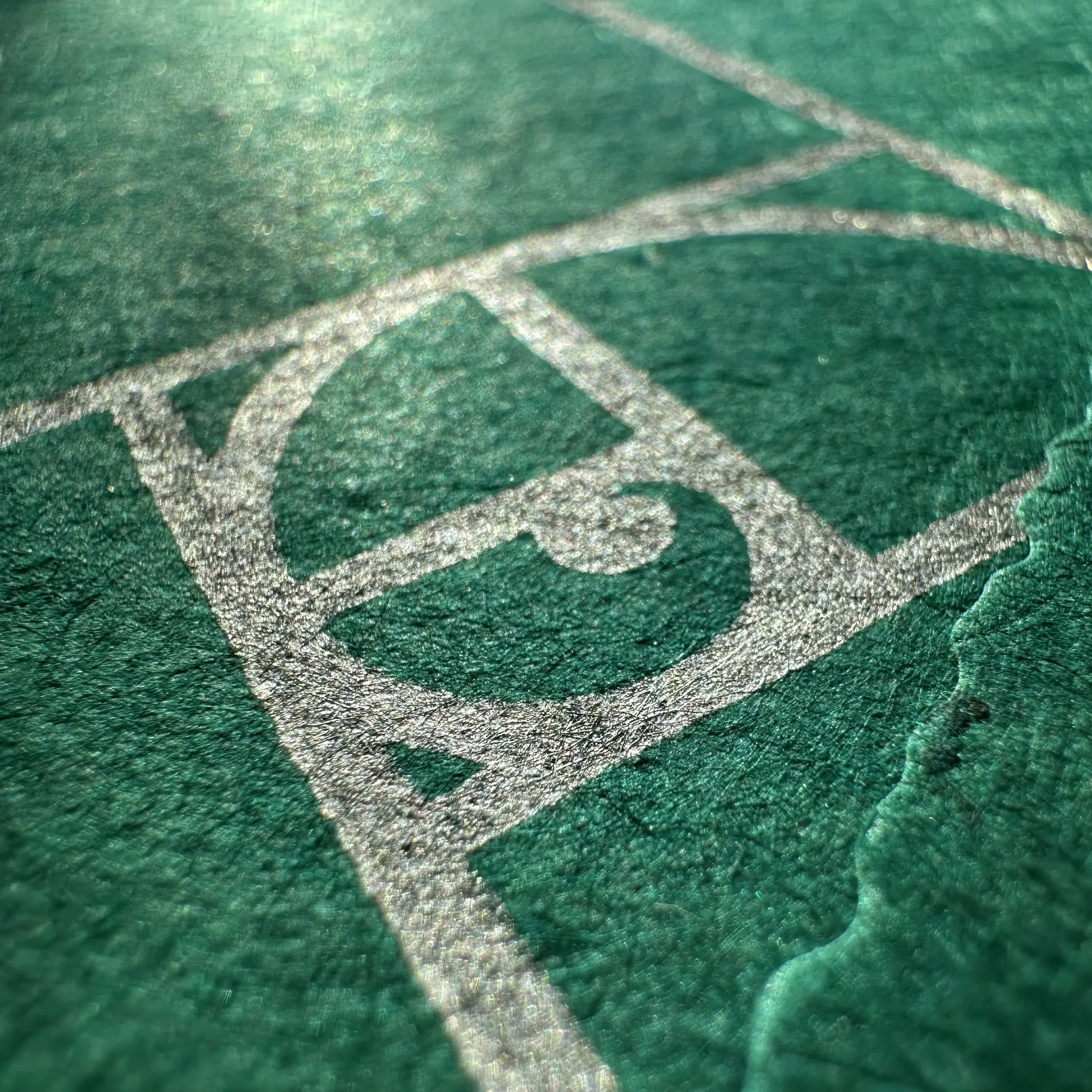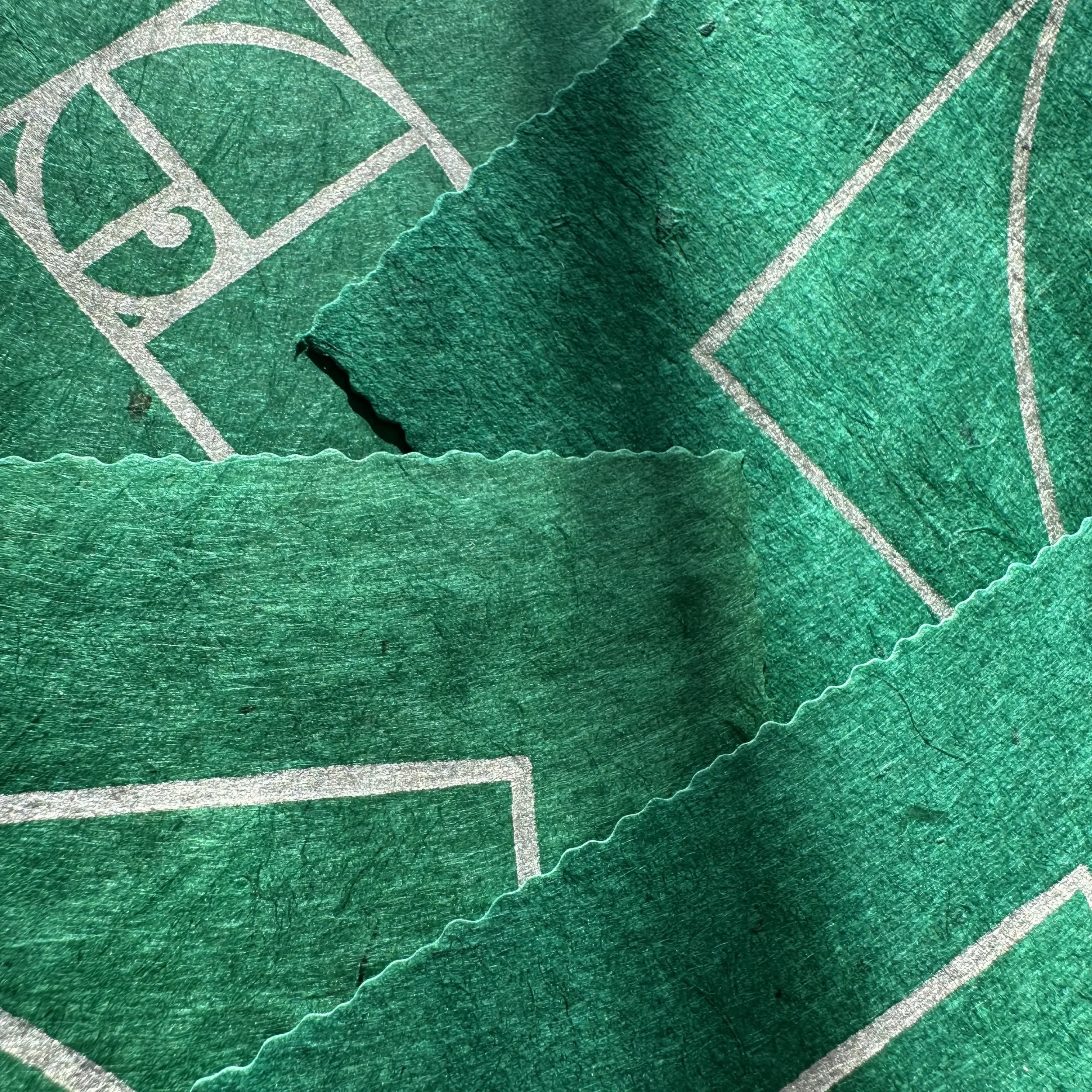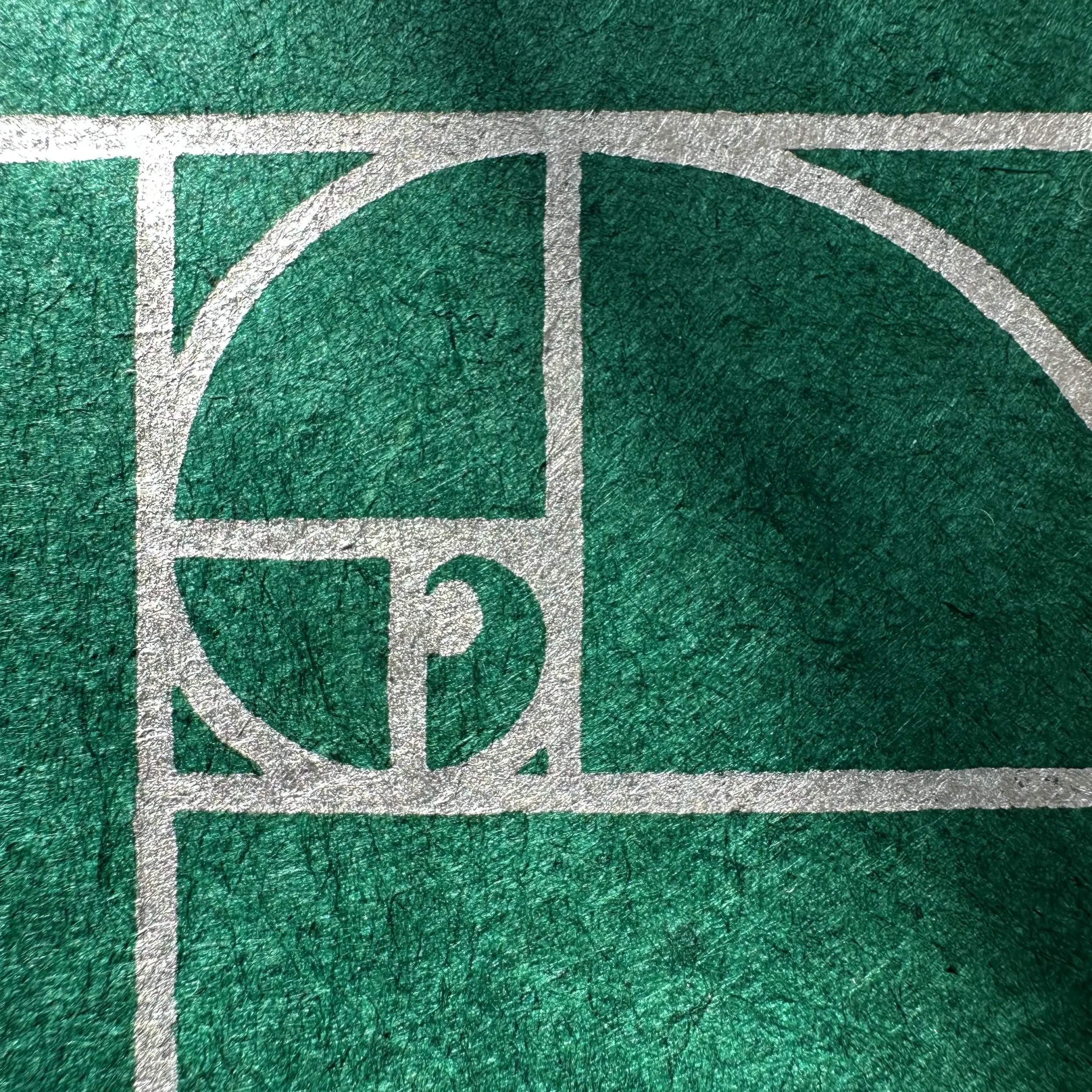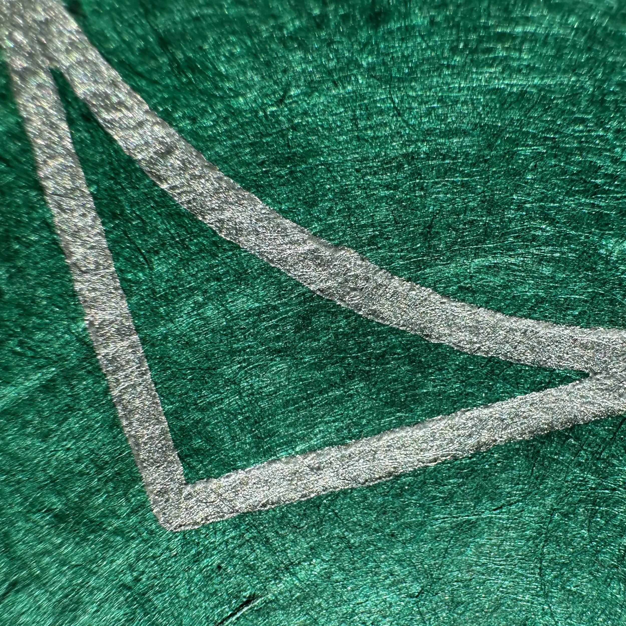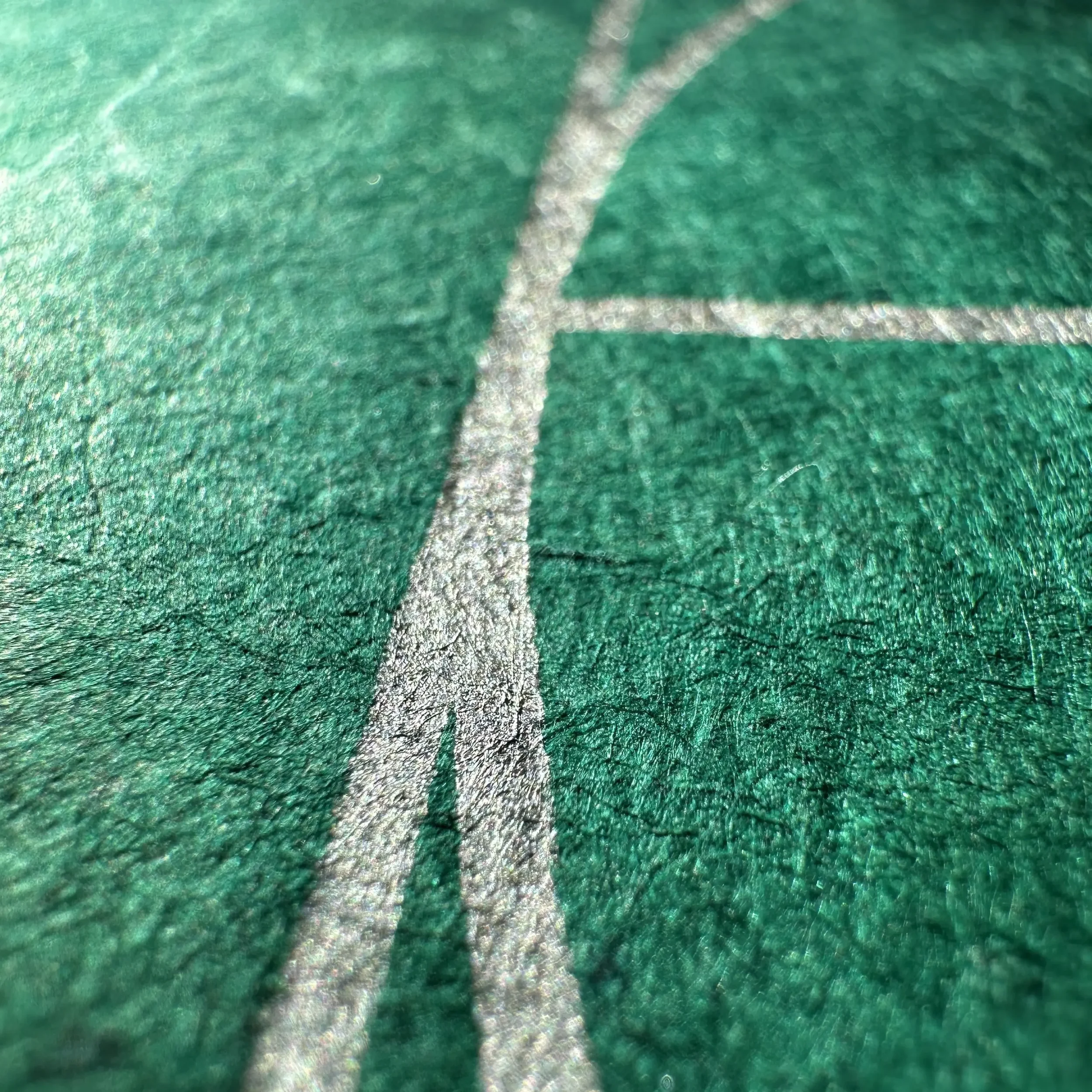 Besonders die Materialität steht hier im Fokus: Das smaragdgrüne Loktapapier wird unter fairen Bedingungen in den Hochlagen des Himalayas handgeschöpft. Es ist ökologisch nachhaltig, robust und besticht durch eine lebendige Struktur. In Kombination mit der kühlen, silbernen Hochdruckfarbe entsteht ein moderner, fast mystischer Kontrast, der die feinen Linien des handgeschnitzten Motivs präzise hervorhebt.