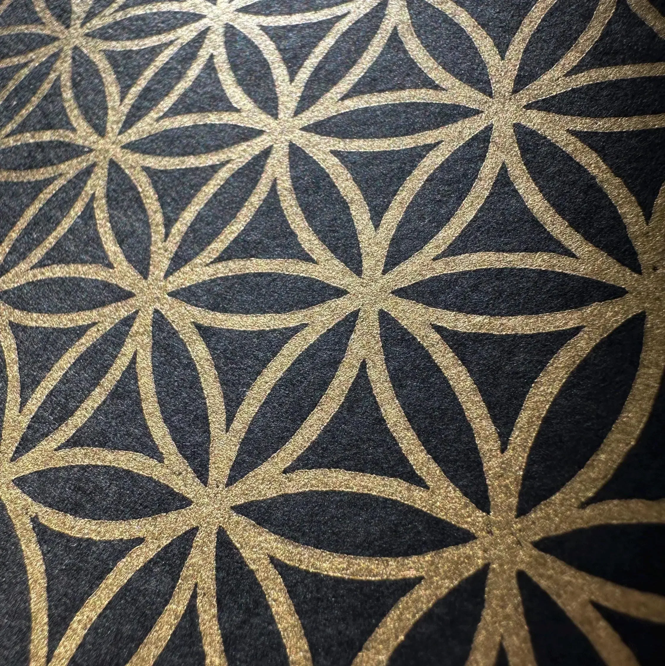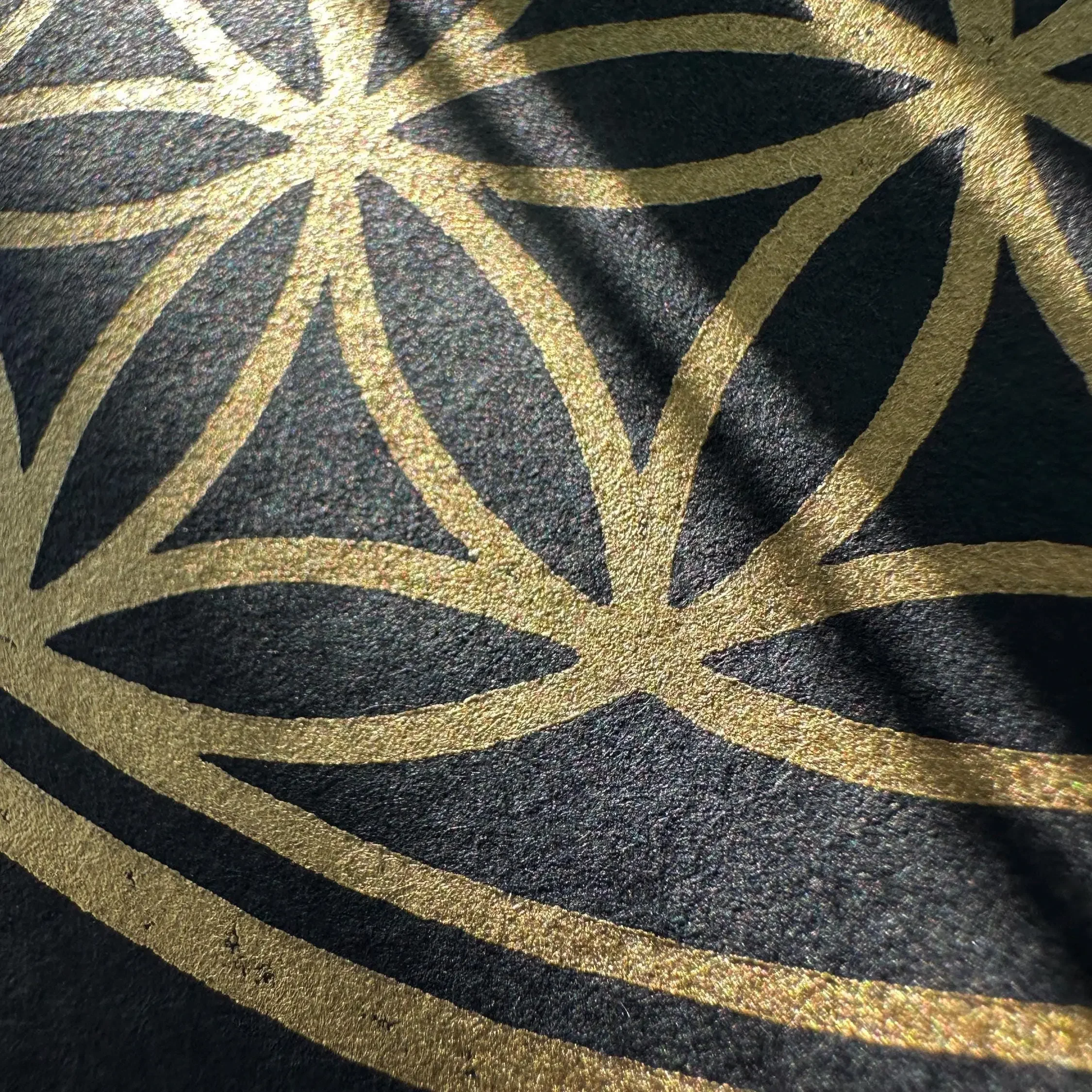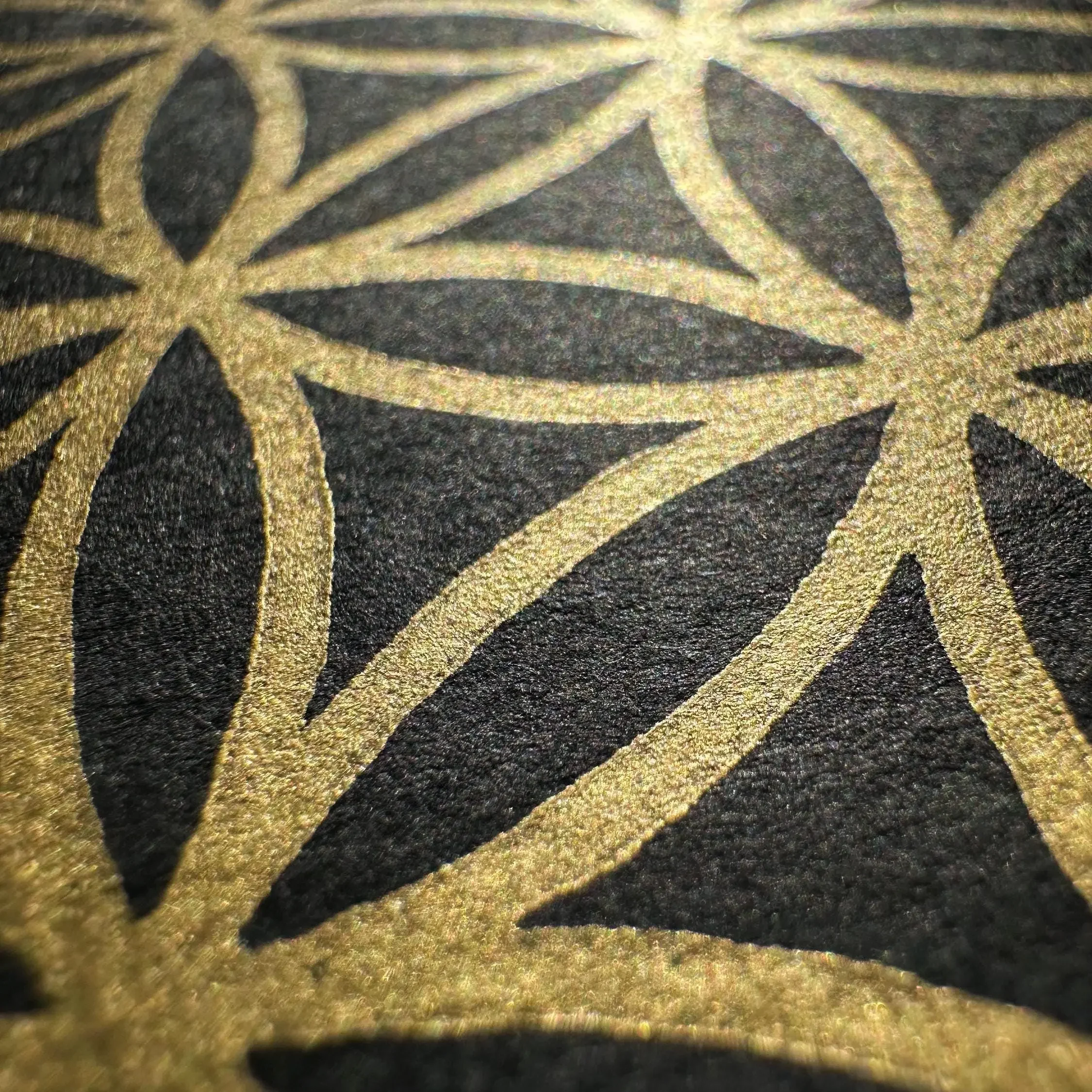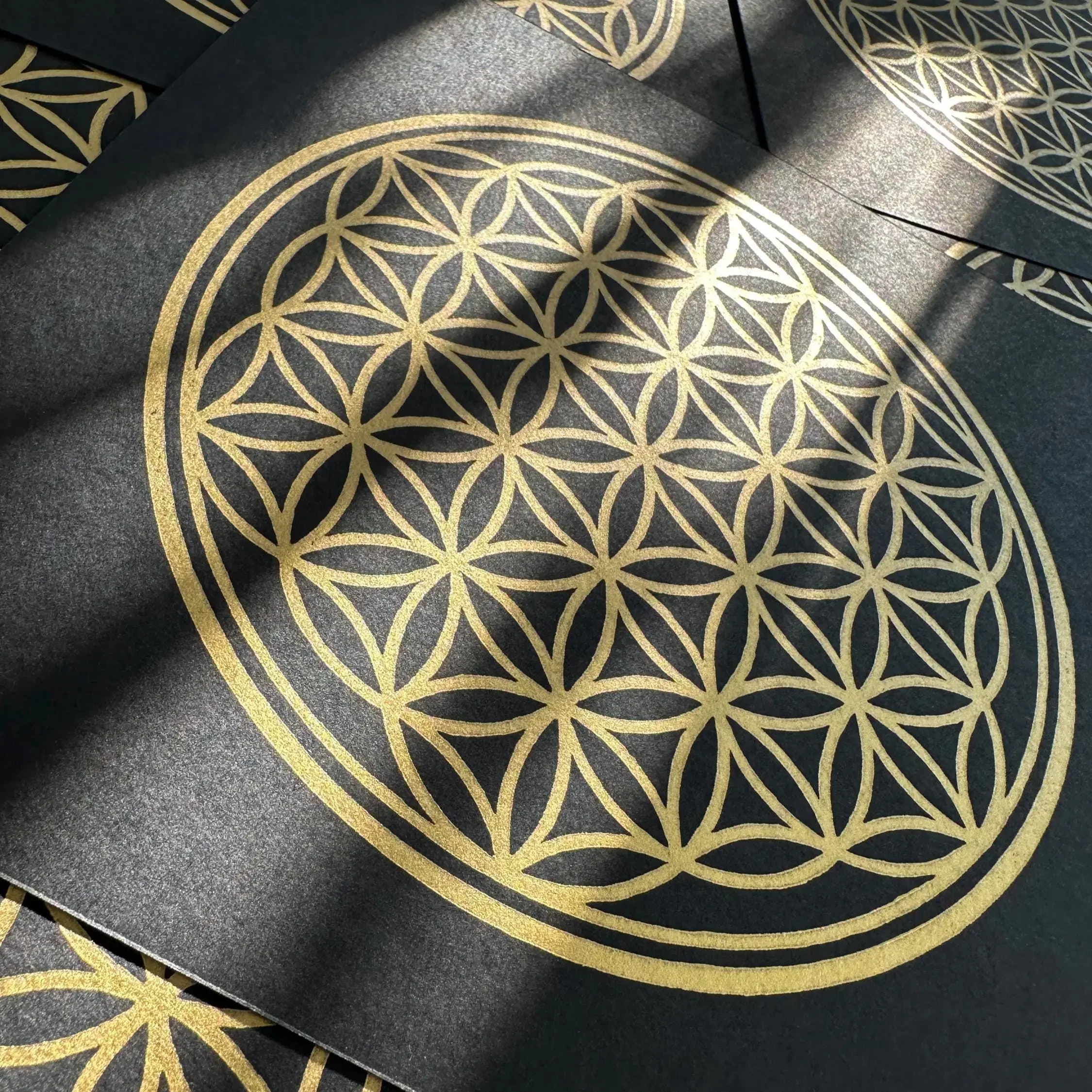 Das Motiv der klassischen Blume des Lebens mit 30 Kreisen wird bei dieser Variante auf das exquisite „Sirio Black/Black“ Papier gedruckt. Mit 280 g/m² ist dieses Feinstpapier nicht nur robust, sondern besticht durch seine intensive, durchgefärbte Schwärze. Die goldene Hochdruckfarbe auf Ölbasis setzt darauf brillante Akzente und erzeugt je nach Blickwinkel ein faszinierendes Funkeln, das die Geometrie zum Leuchten bringt.