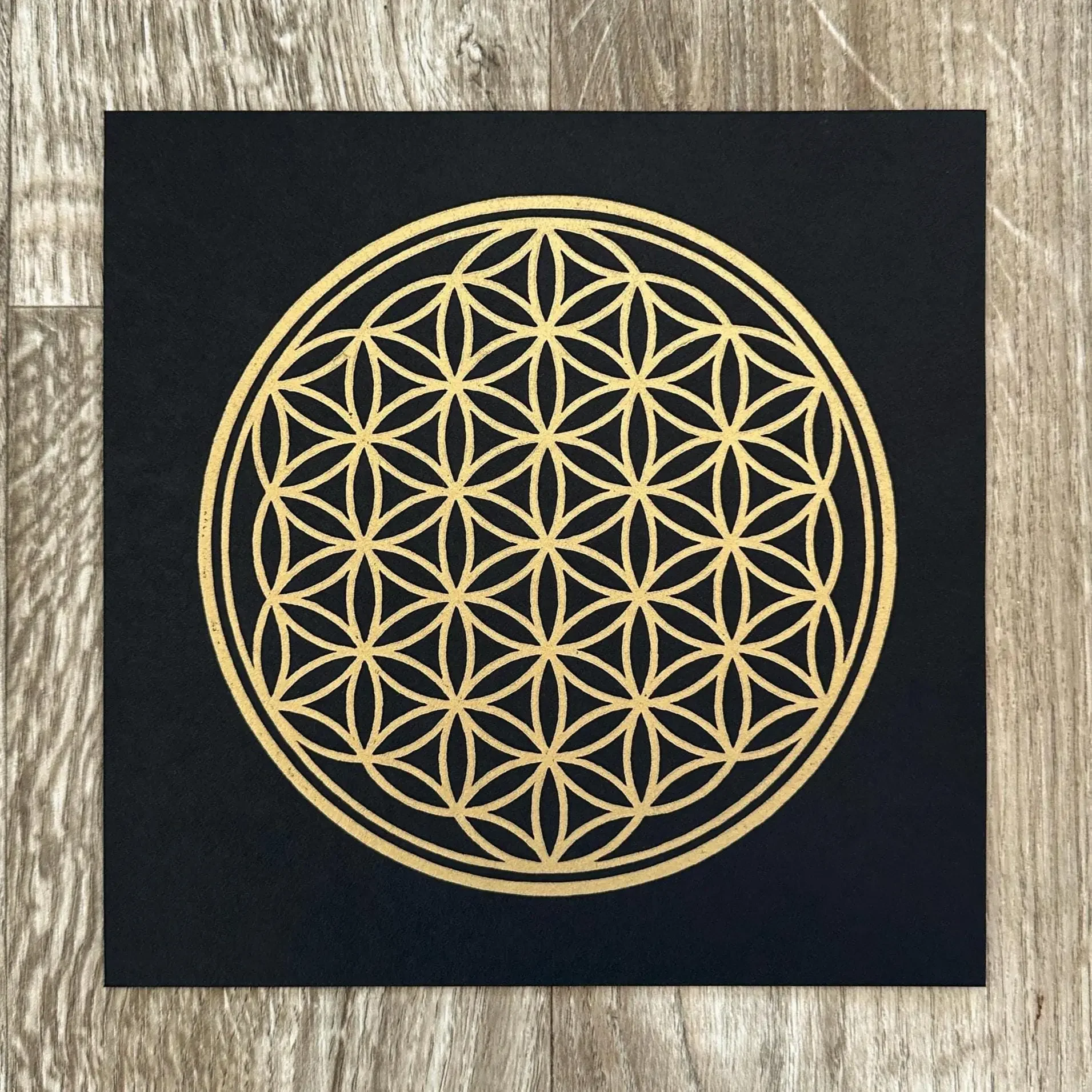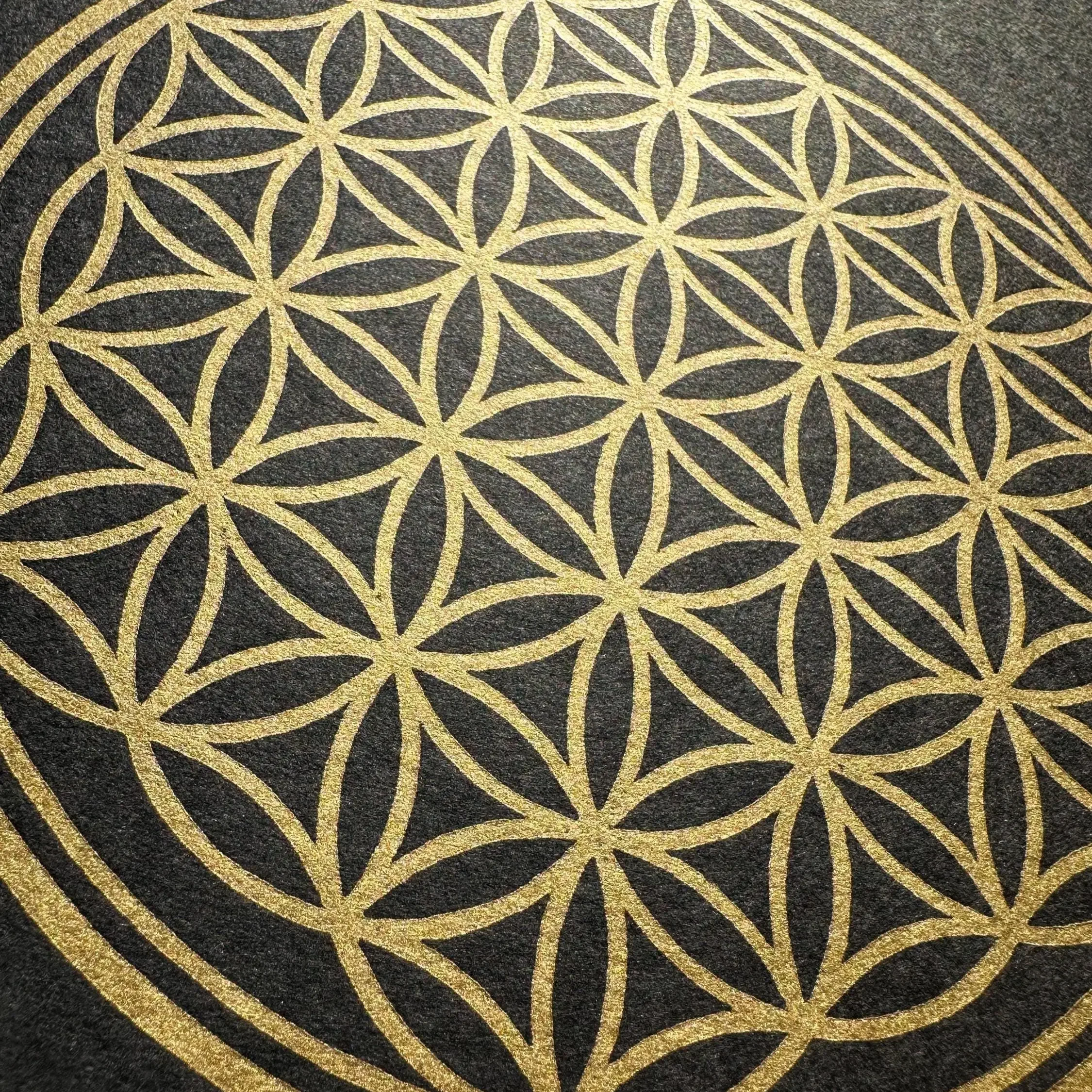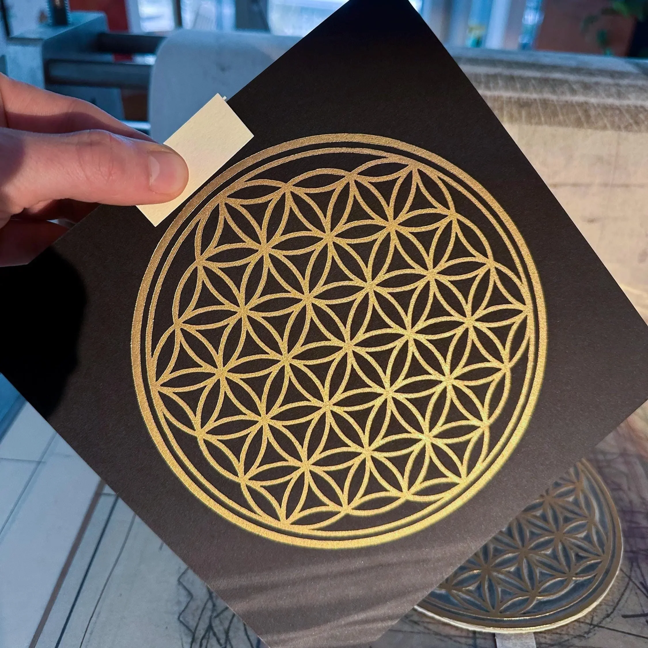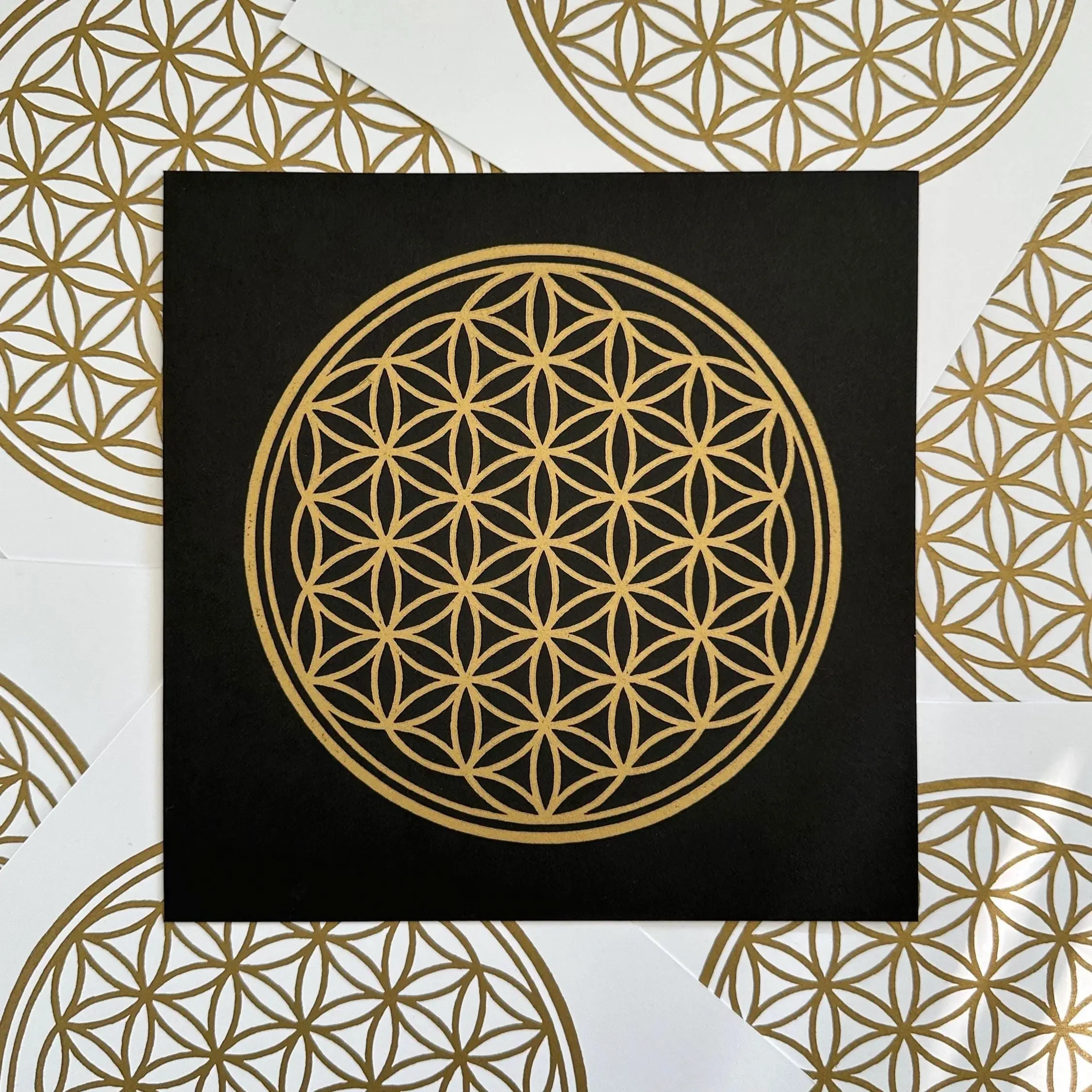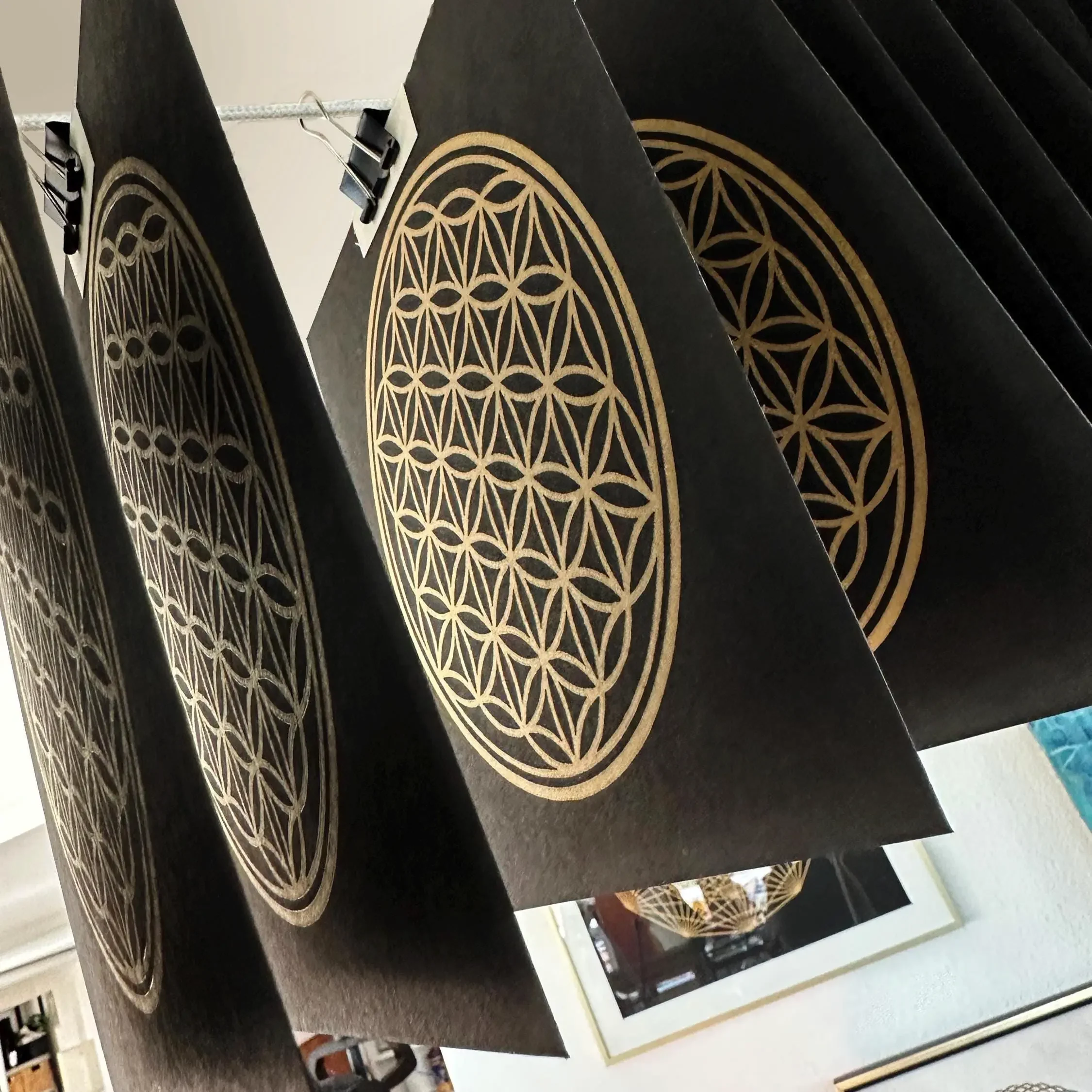 Das Motiv der klassischen Blume des Lebens mit 30 Kreisen wird bei dieser Variante auf das exquisite „Sirio Black/Black“ Papier gedruckt. Mit 280 g/m² ist dieses Feinstpapier nicht nur robust, sondern besticht durch seine intensive, durchgefärbte Schwärze. Die goldene Hochdruckfarbe auf Ölbasis setzt darauf brillante Akzente und erzeugt je nach Blickwinkel ein faszinierendes Funkeln, das die Geometrie zum Leuchten bringt.