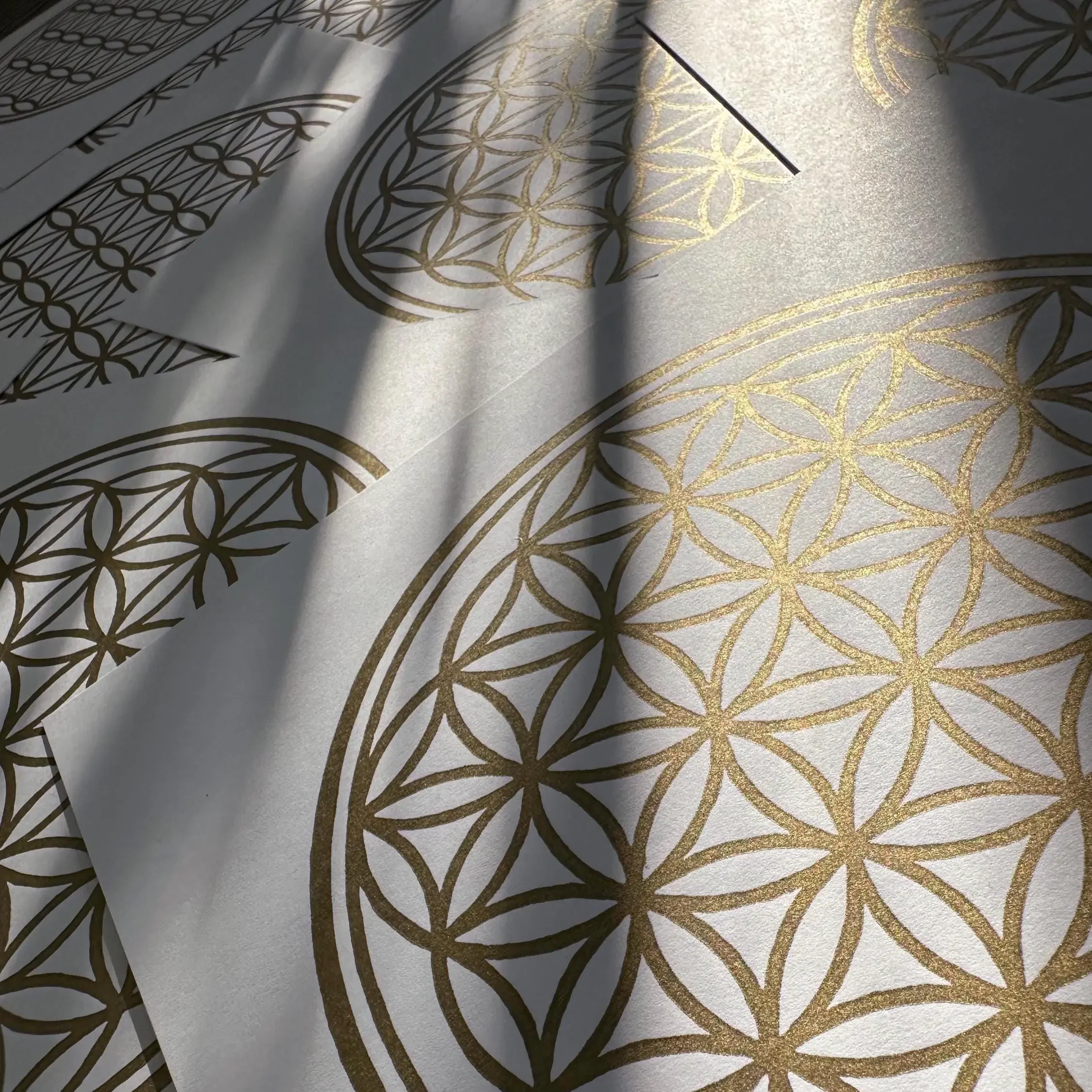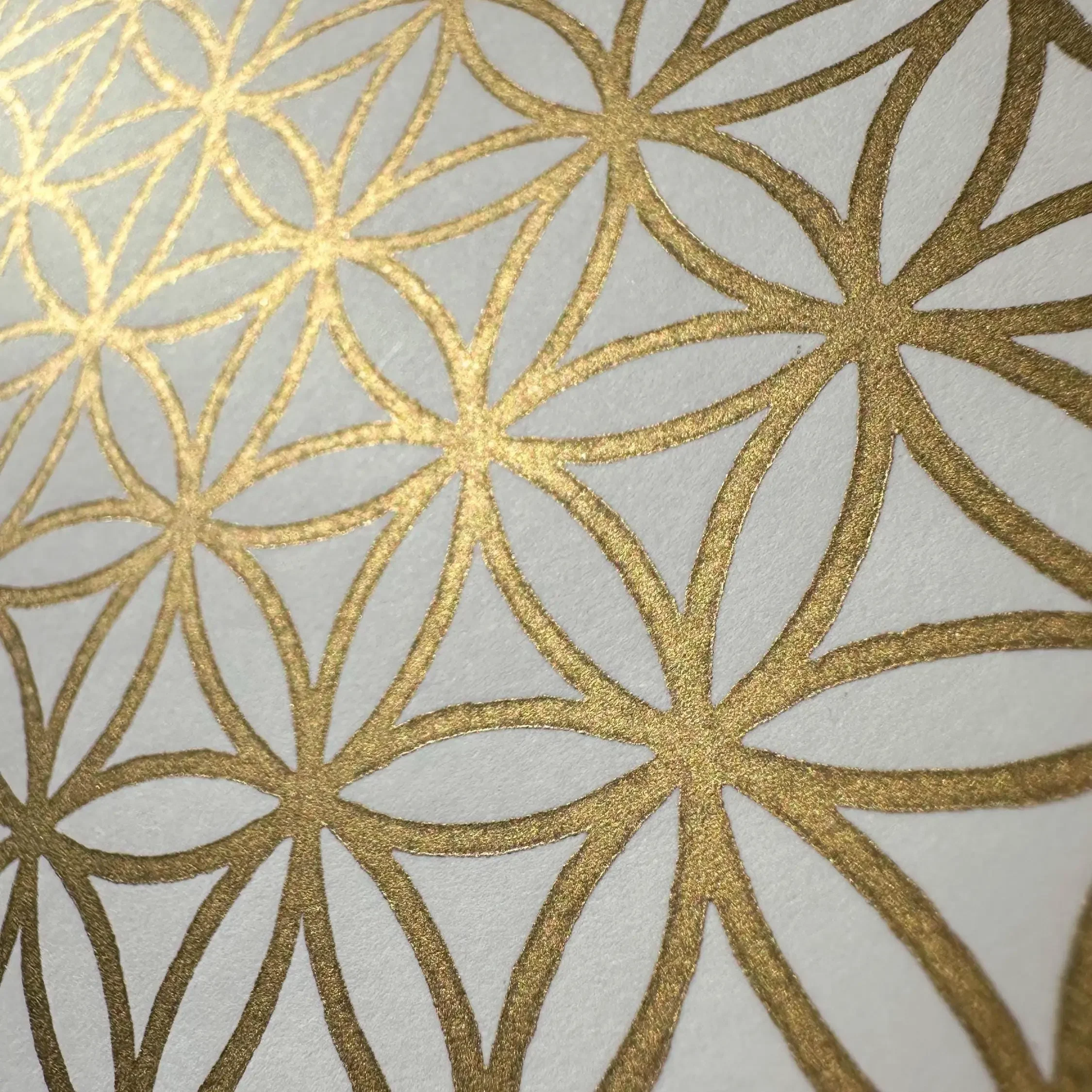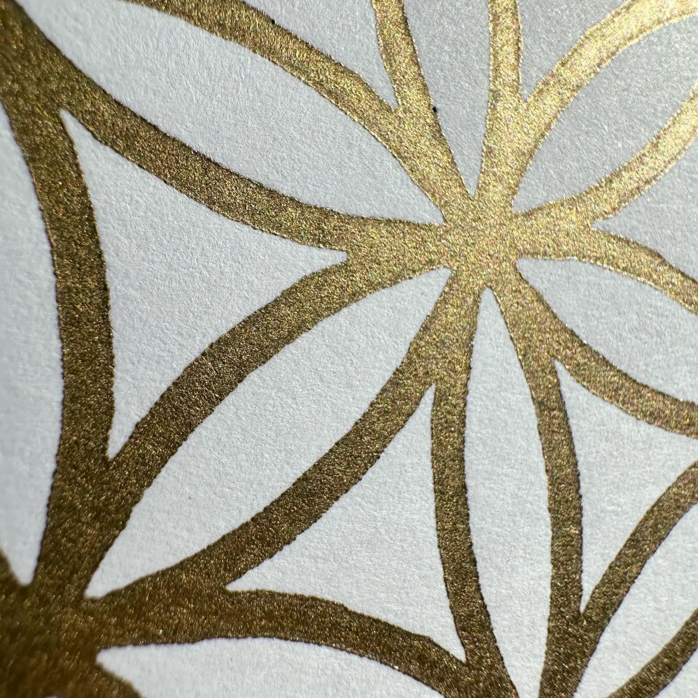 Für diese helle Edition verwende ich das außergewöhnlich weiße „Sirio White/White“ Papier, das mit einer Grammatur von 400 g/m² eine bemerkenswerte Stabilität und eine hochwertige Haptik bietet. Das klassische Design mit 30 Kreisen erzeugt eine lichtvolle, fast schwebende Optik. Die goldene Hochdruckfarbe auf Ölbasis ist so gewählt, dass sie das einfallende Licht sanft reflektiert und dem Druck eine lebendige Aura verleiht.