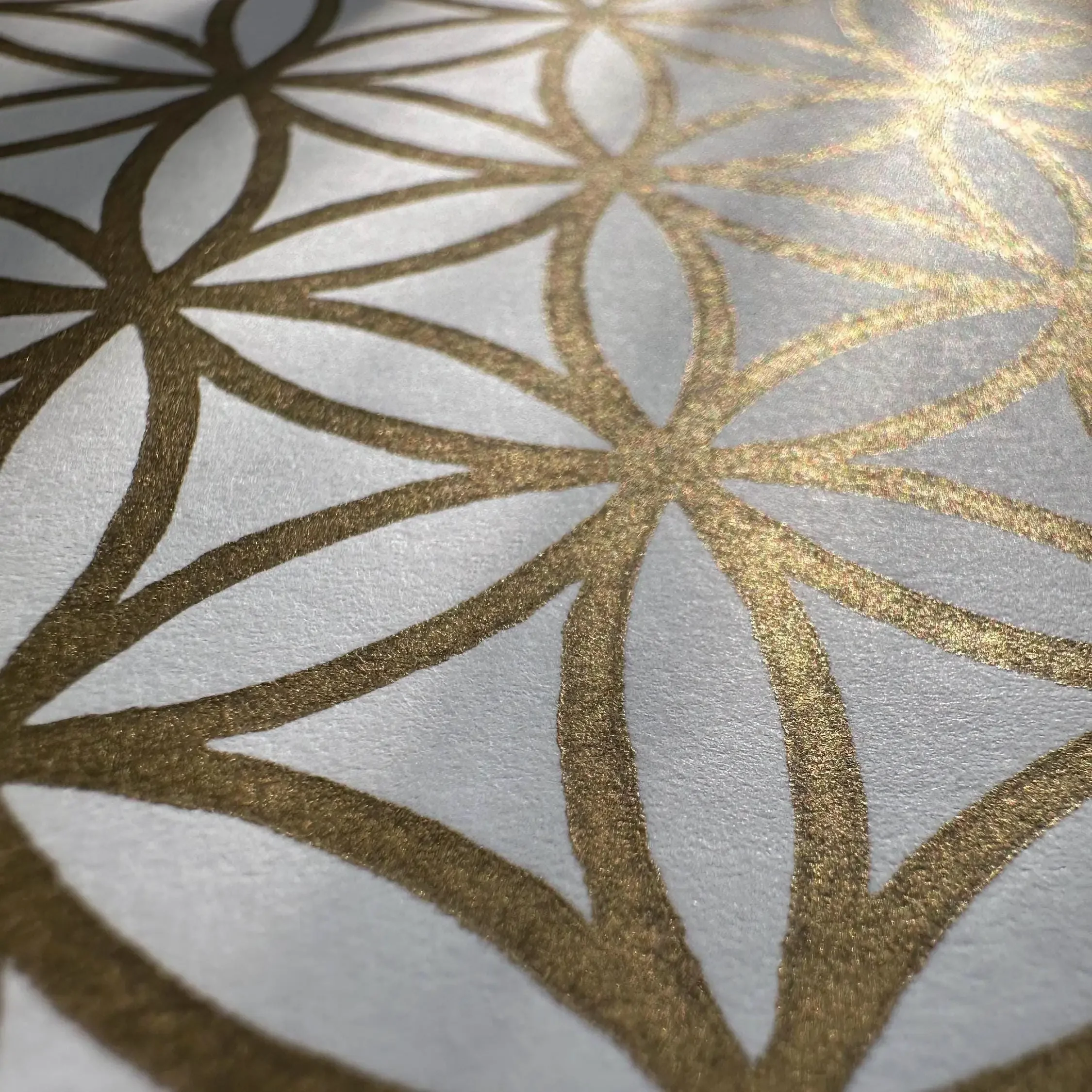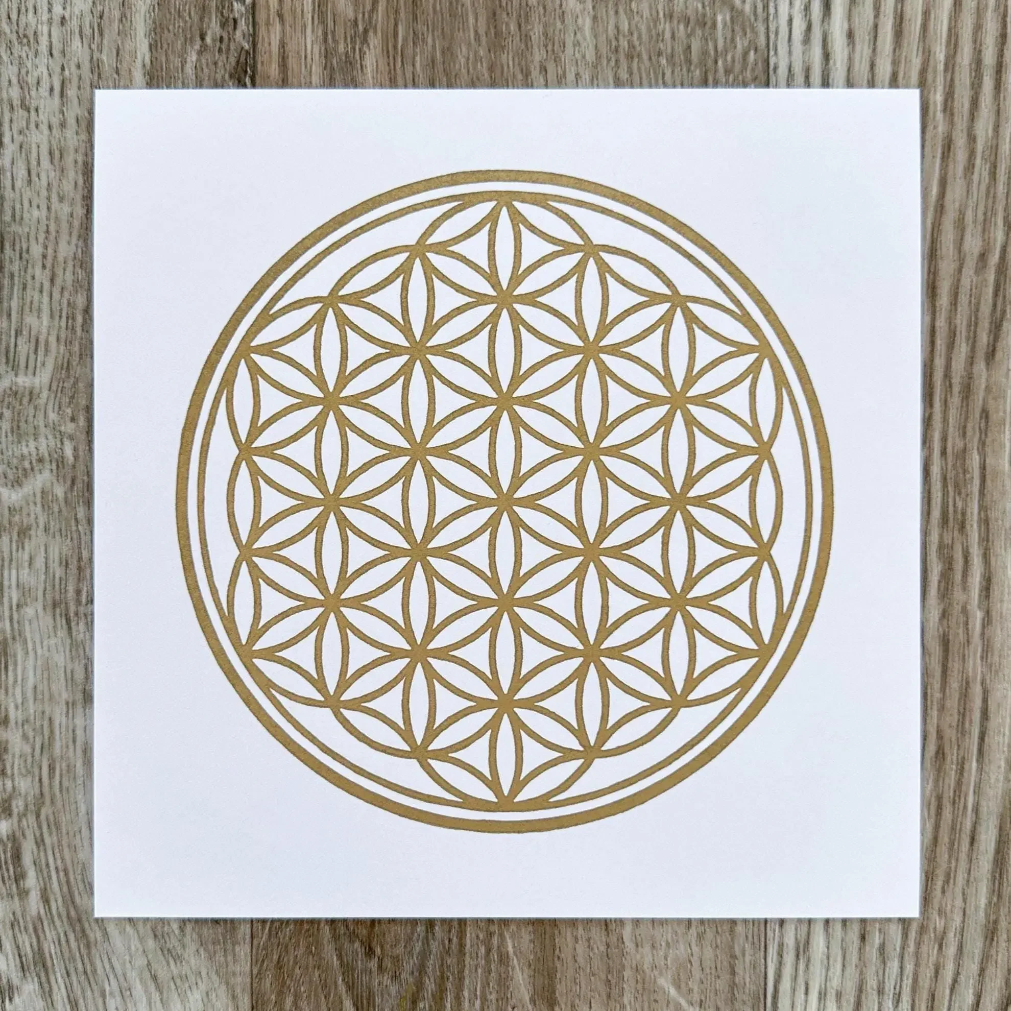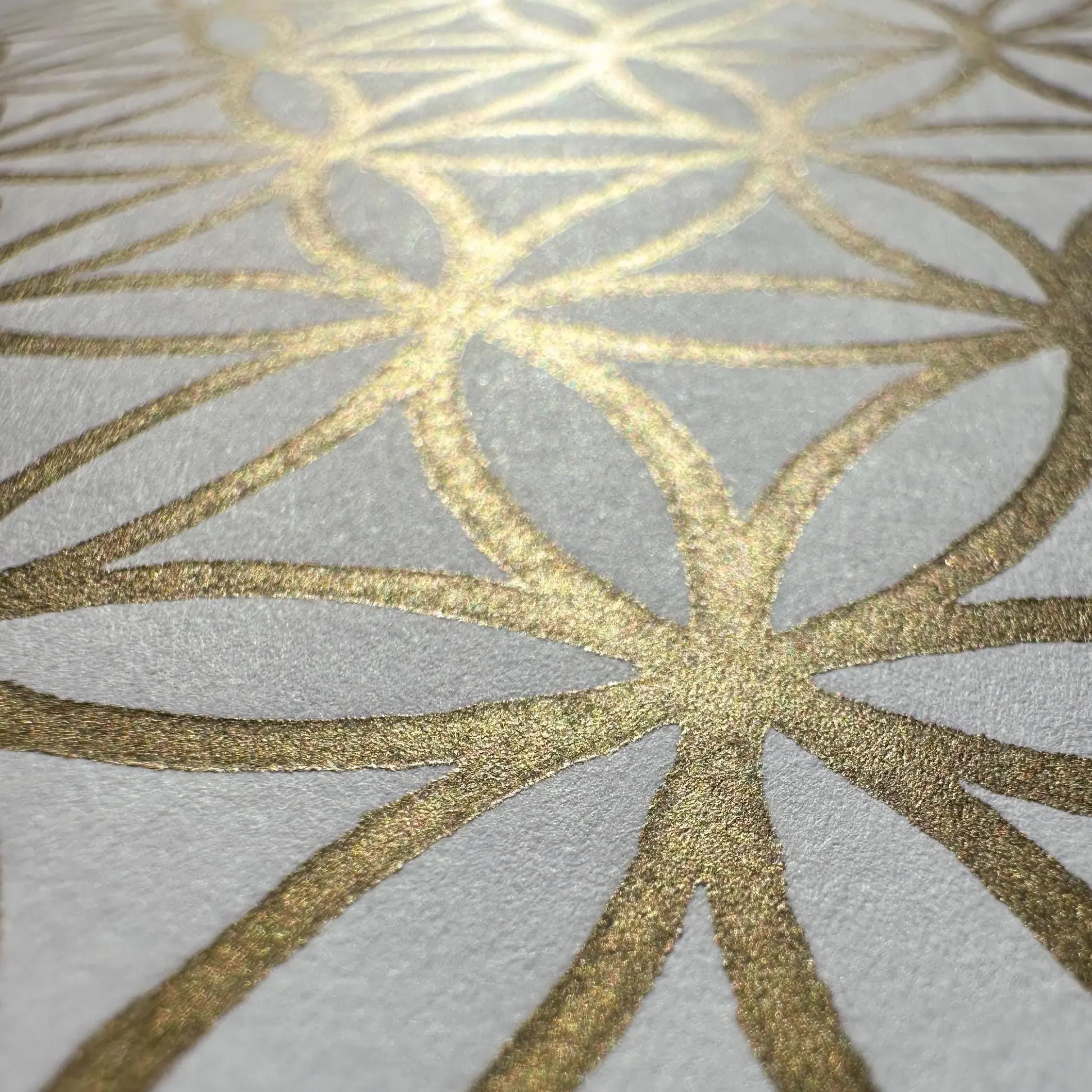 Für diese helle Edition verwende ich das außergewöhnlich weiße „Sirio White/White“ Papier, das mit einer Grammatur von 400 g/m² eine bemerkenswerte Stabilität und eine hochwertige Haptik bietet. Das klassische Design mit 30 Kreisen erzeugt eine lichtvolle, fast schwebende Optik. Die goldene Hochdruckfarbe auf Ölbasis ist so gewählt, dass sie das einfallende Licht sanft reflektiert und dem Druck eine lebendige Aura verleiht.