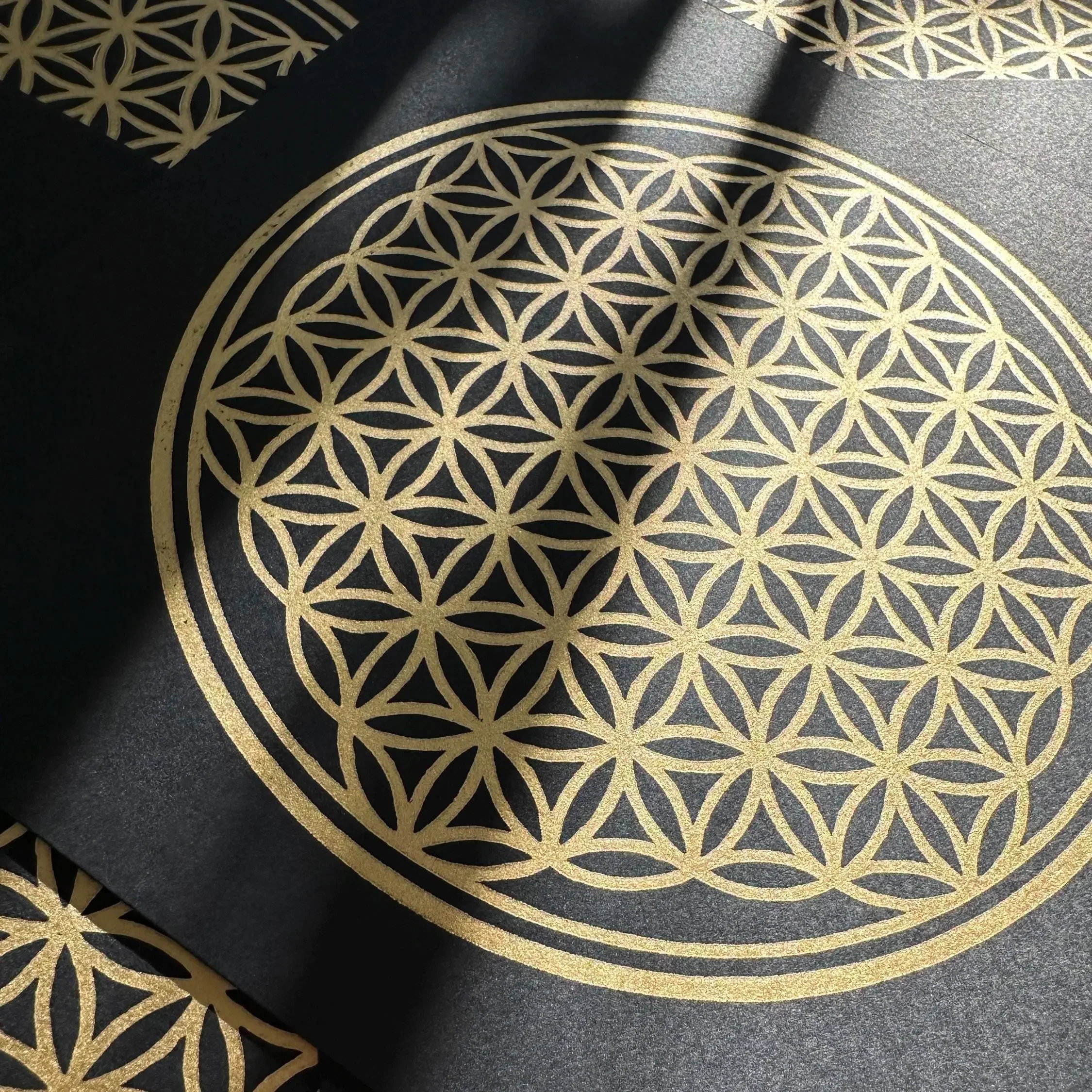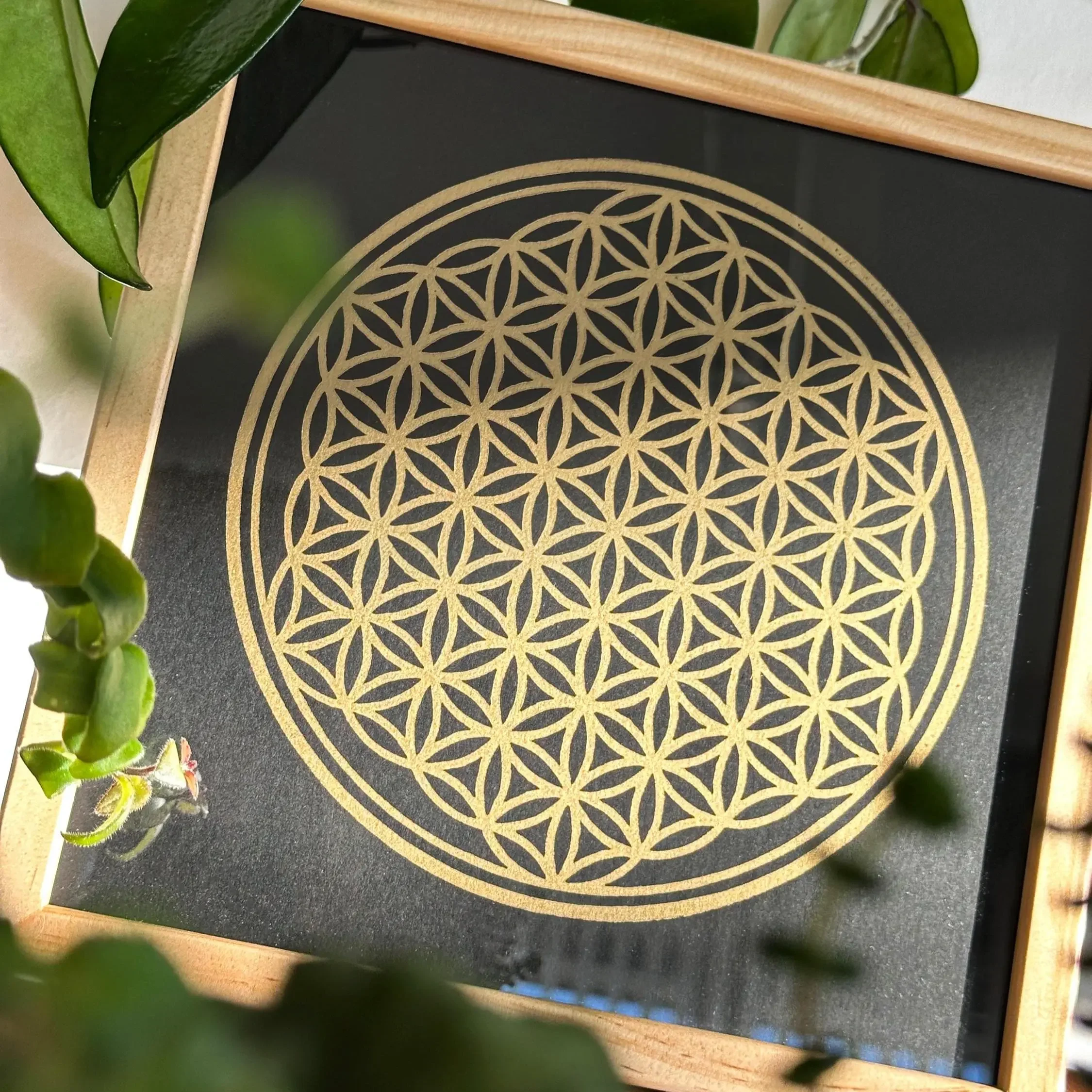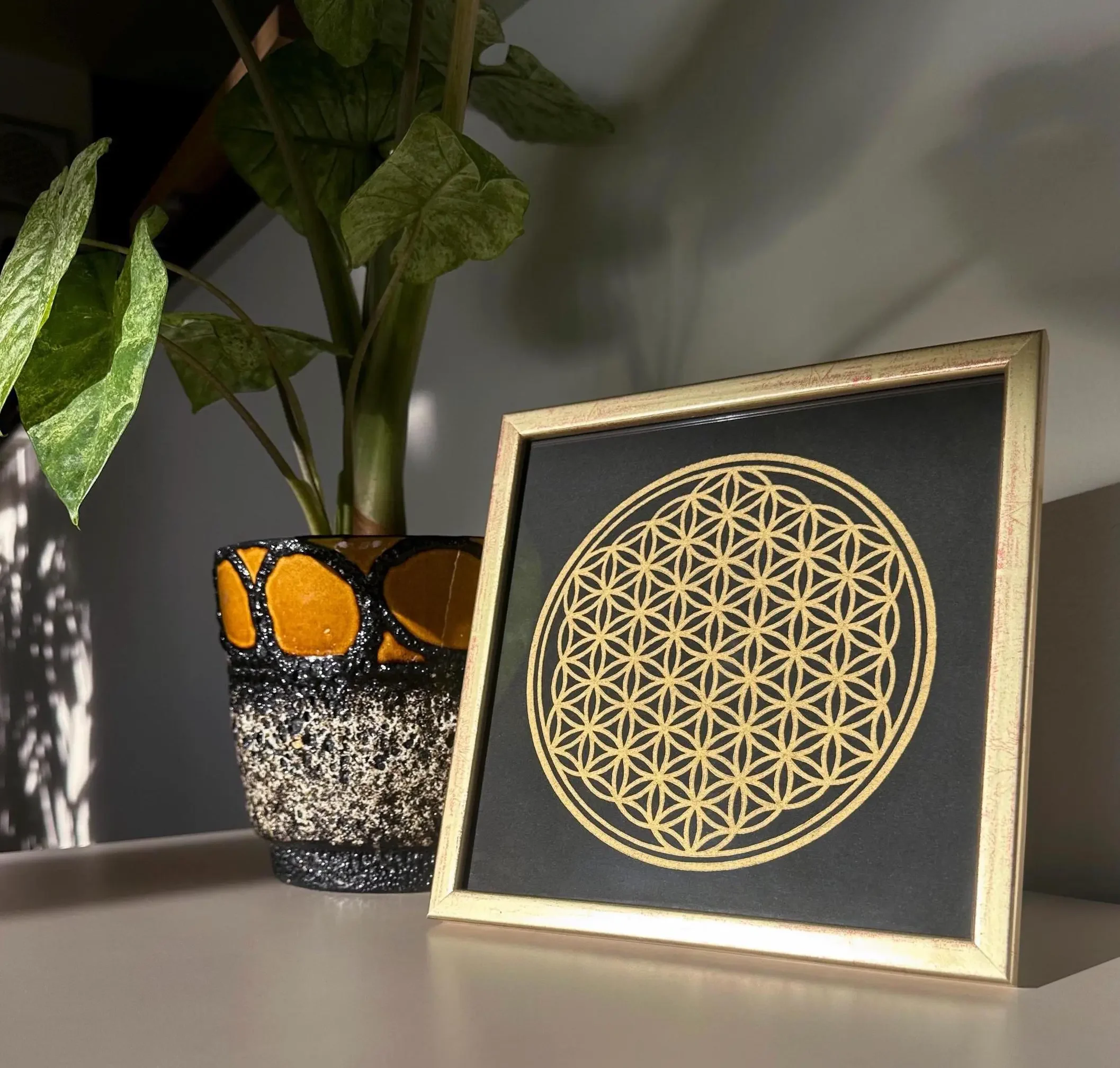 Auf dem durchgefärbten „Sirio Black/Black“ Papier (280 g/m²) wirkt das filigrane Goldnetz fast mystisch, als würde es im Raum schweben. Die ölbasierte Goldfarbe reflektiert das Licht in vielen feinen Nuancen. Das Außenmaß des Rahmens beträgt ca. 22 x 22 cm. Bei der Platzierung hast du die volle Freiheit: Du kannst den Rahmen entweder an die Wand hängen oder ihn durch den stabilen Aufsteller auf der Rückseite dekorativ auf einer Kommode oder einem Altar aufstellen.