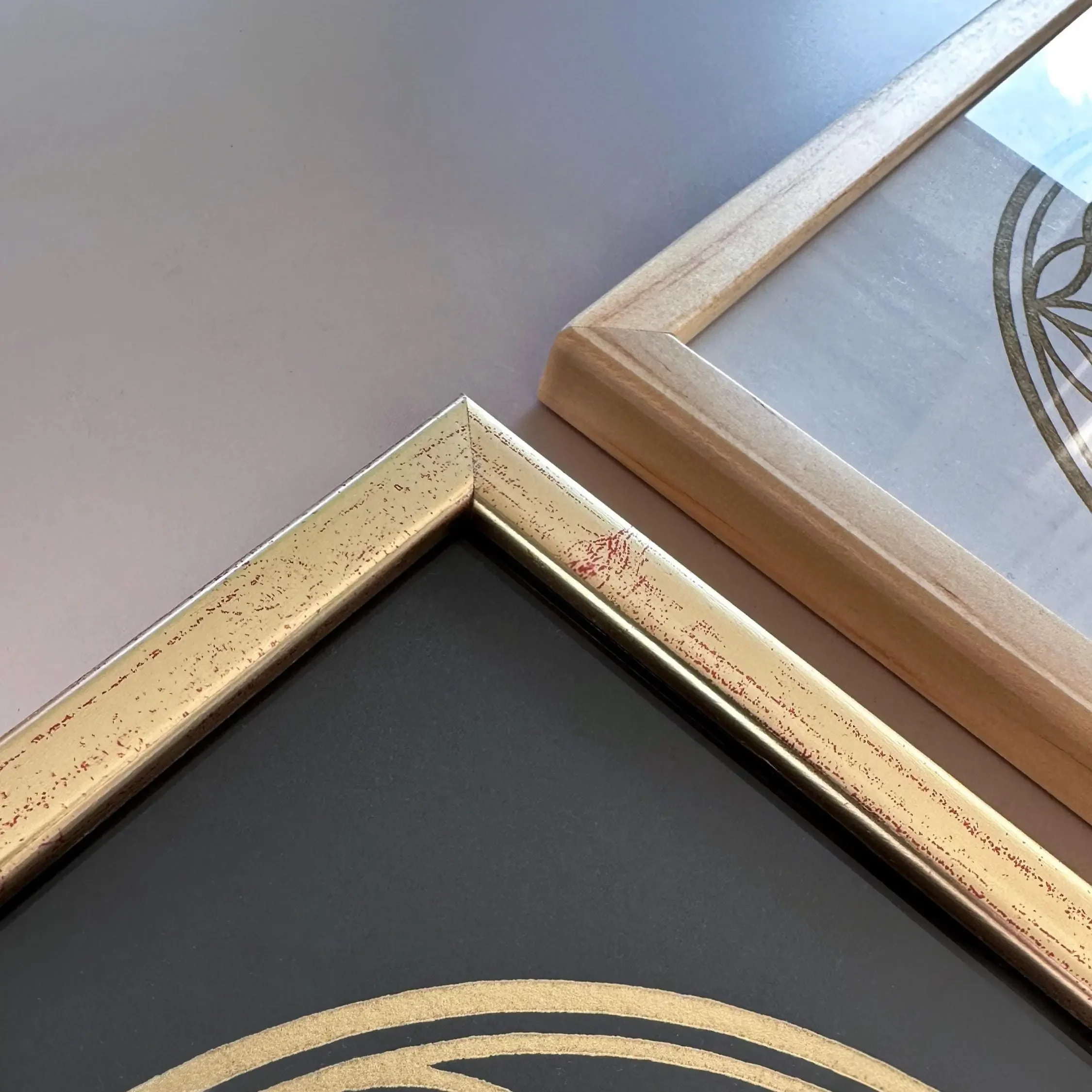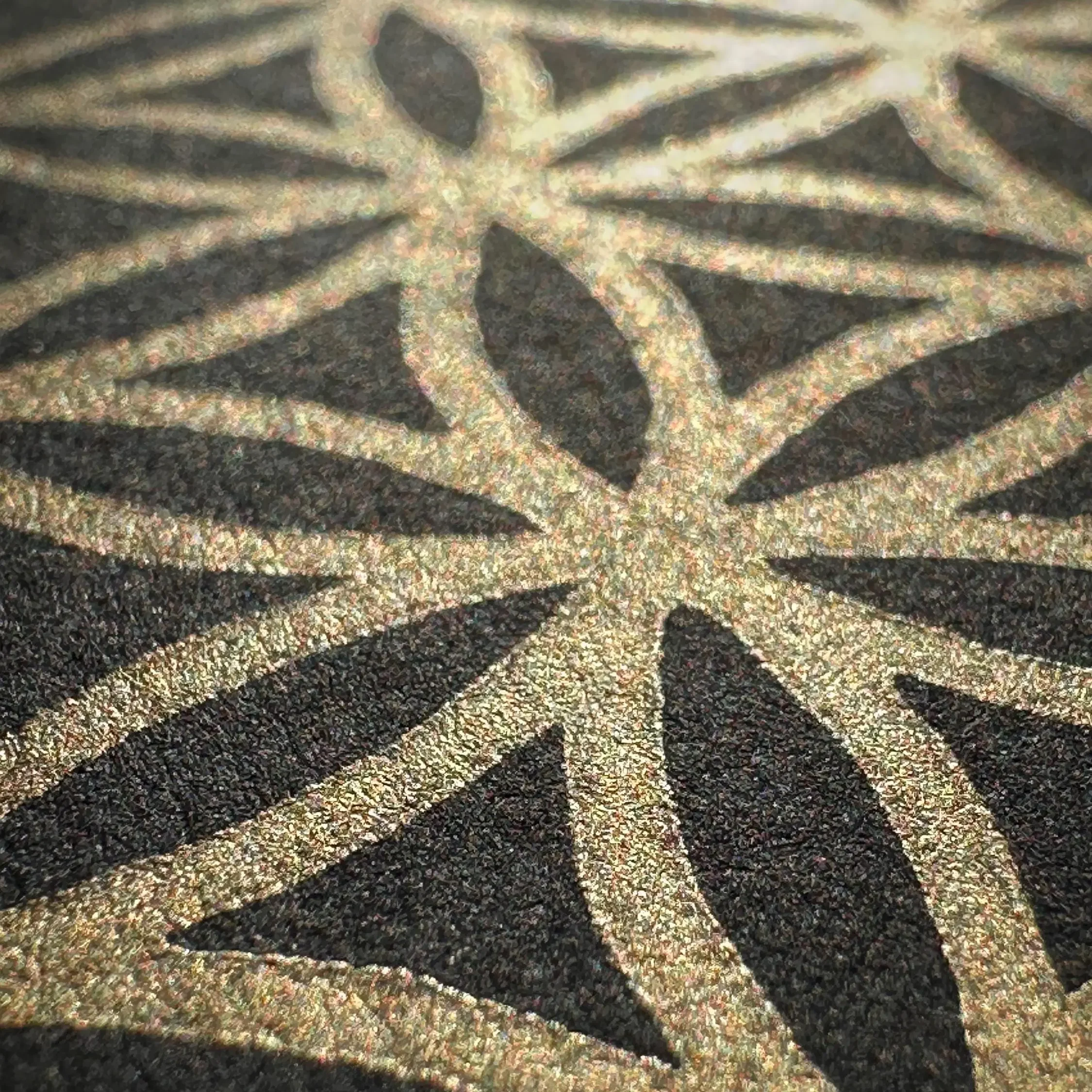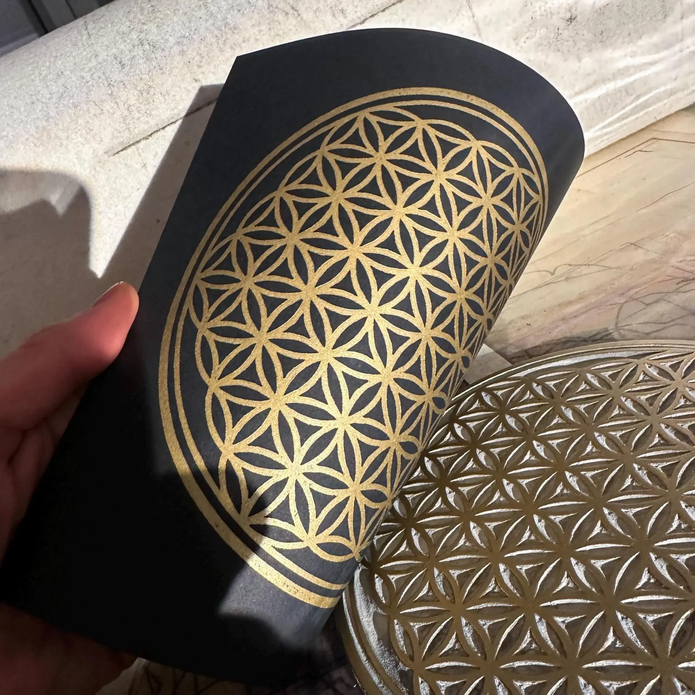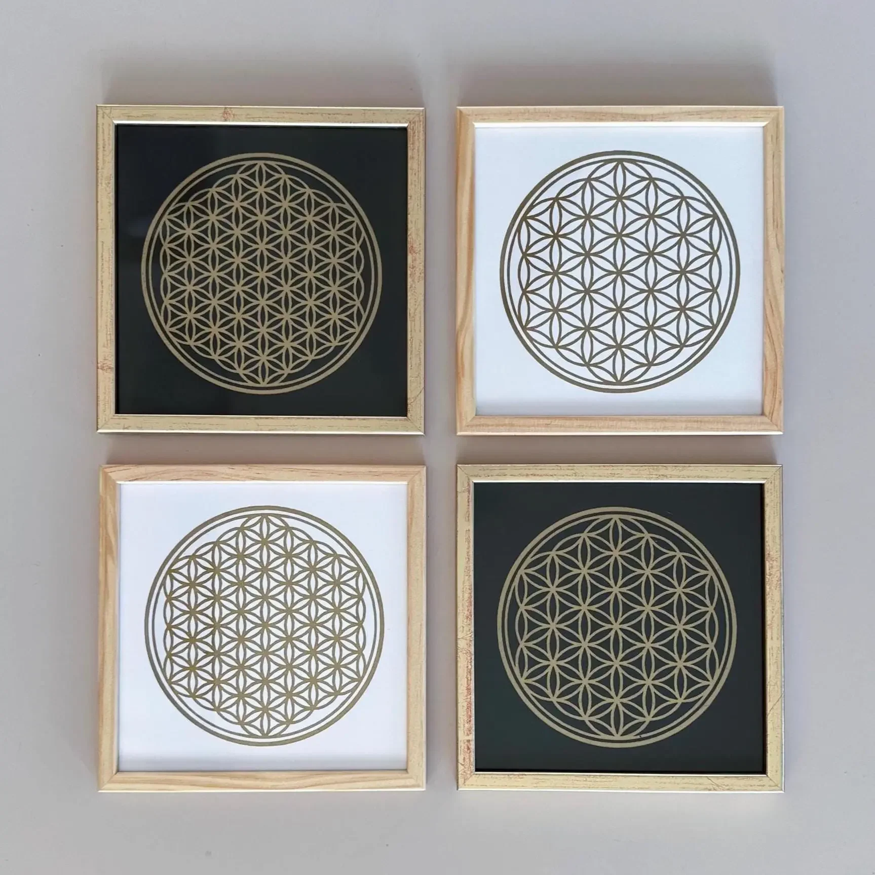 Auf dem durchgefärbten „Sirio Black/Black“ Papier (280 g/m²) wirkt das filigrane Goldnetz fast mystisch, als würde es im Raum schweben. Die ölbasierte Goldfarbe reflektiert das Licht in vielen feinen Nuancen. Das Außenmaß des Rahmens beträgt ca. 22 x 22 cm. Bei der Platzierung hast du die volle Freiheit: Du kannst den Rahmen entweder an die Wand hängen oder ihn durch den stabilen Aufsteller auf der Rückseite dekorativ auf einer Kommode oder einem Altar aufstellen.