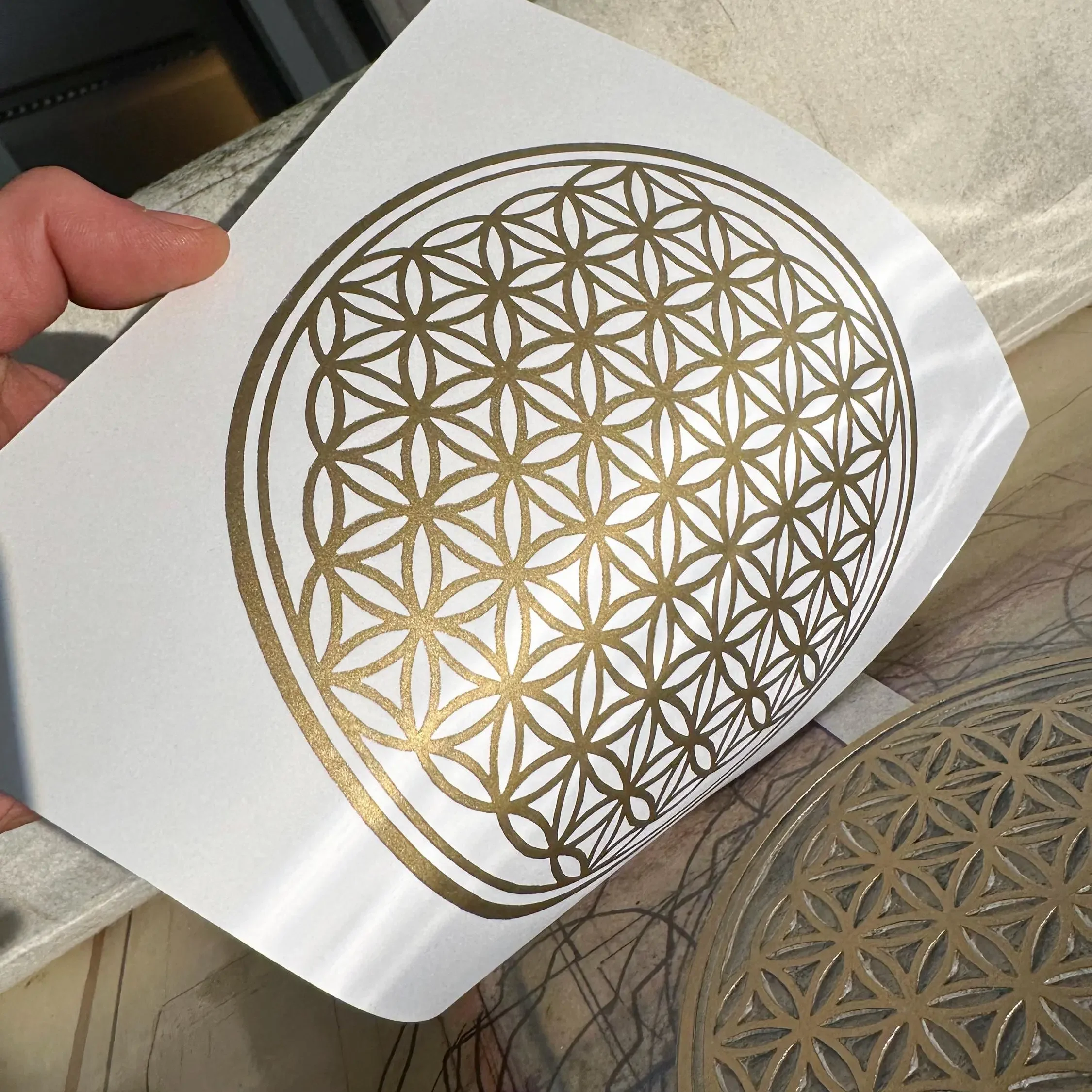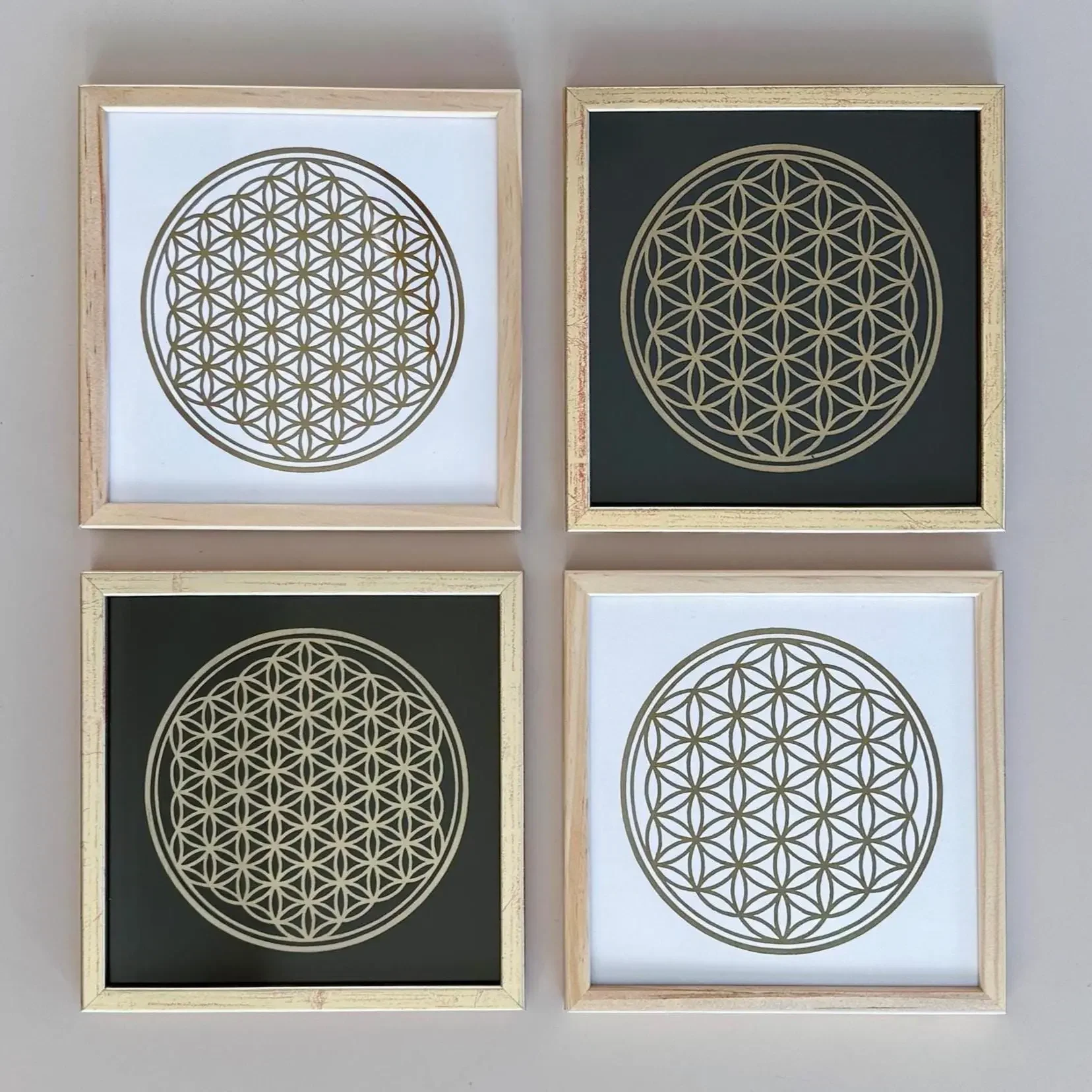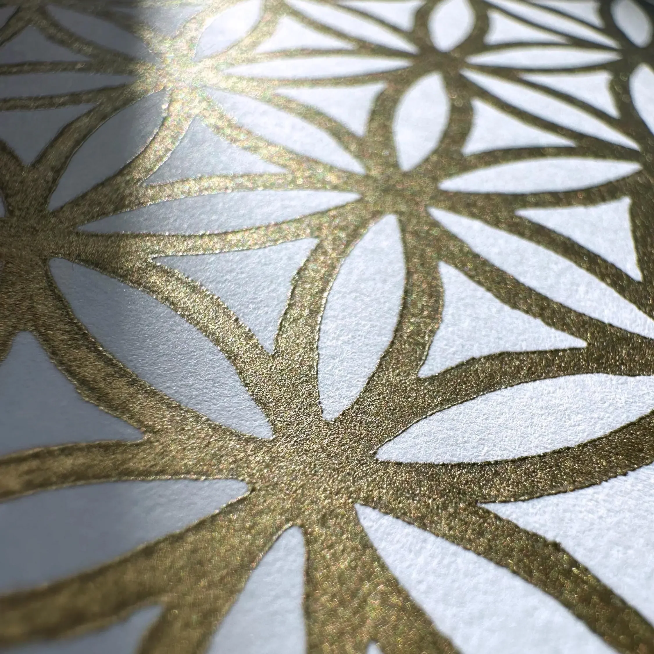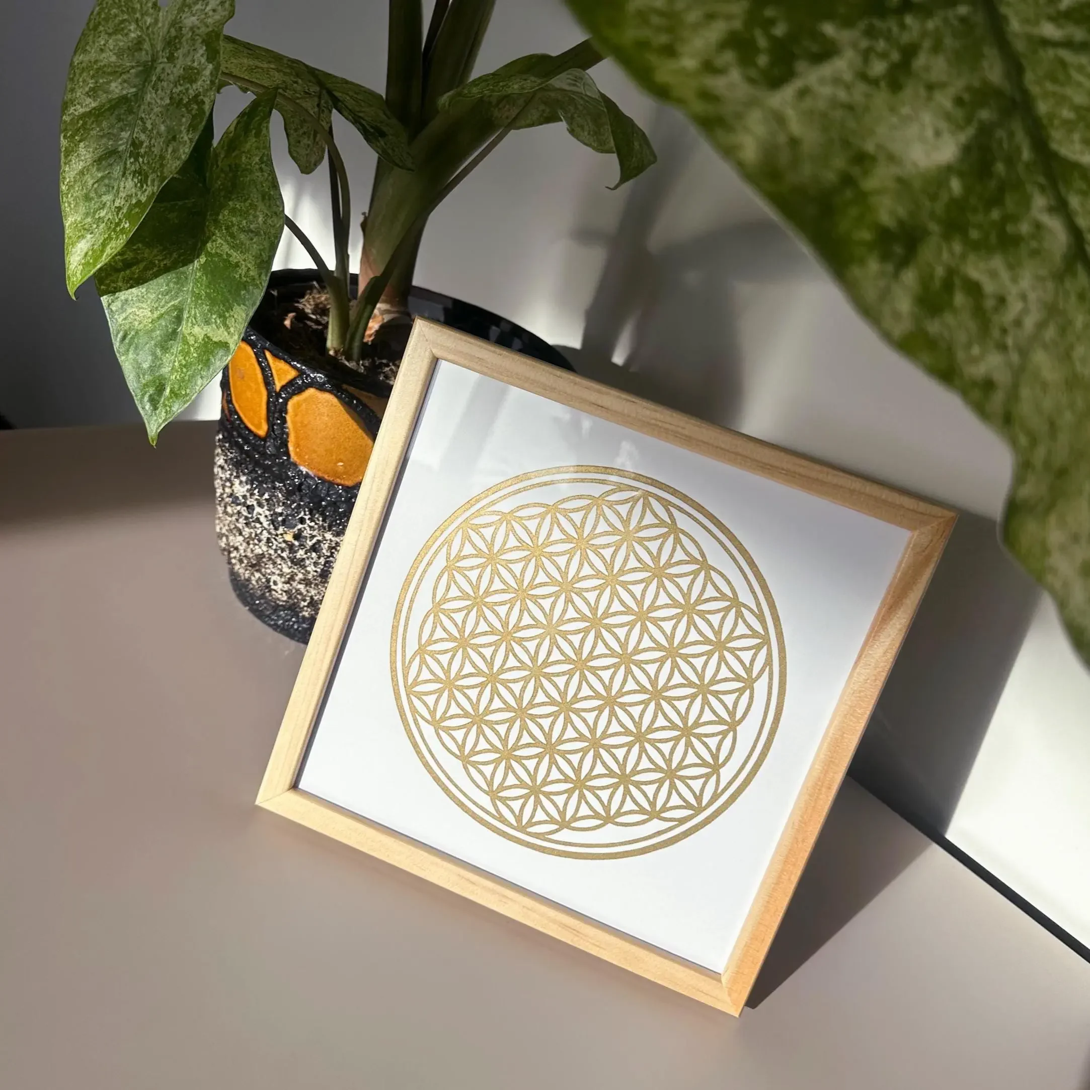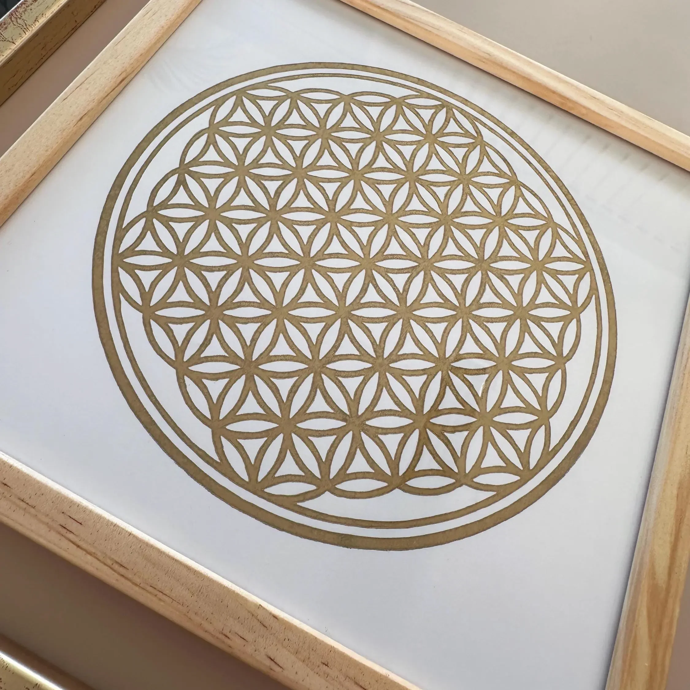 Vereine die Klarheit heiliger Geometrie mit handwerklicher Präzision in deinen Räumen. Dieser handgedruckte Linoldruck wird direkt gerahmt geliefert, wobei du zwischen echtem Eichenholz oder einem klassischen Goldrahmen im Shabby-Stil wählen kannst. Die rote Grundierung des Goldrahmens harmoniert dabei wunderbar mit dem Motiv. Falls du eine andere Gestaltung bevorzugst, findest du den Druck auch ungerahmt oder auf schwarzem Papier in meinem Shop.